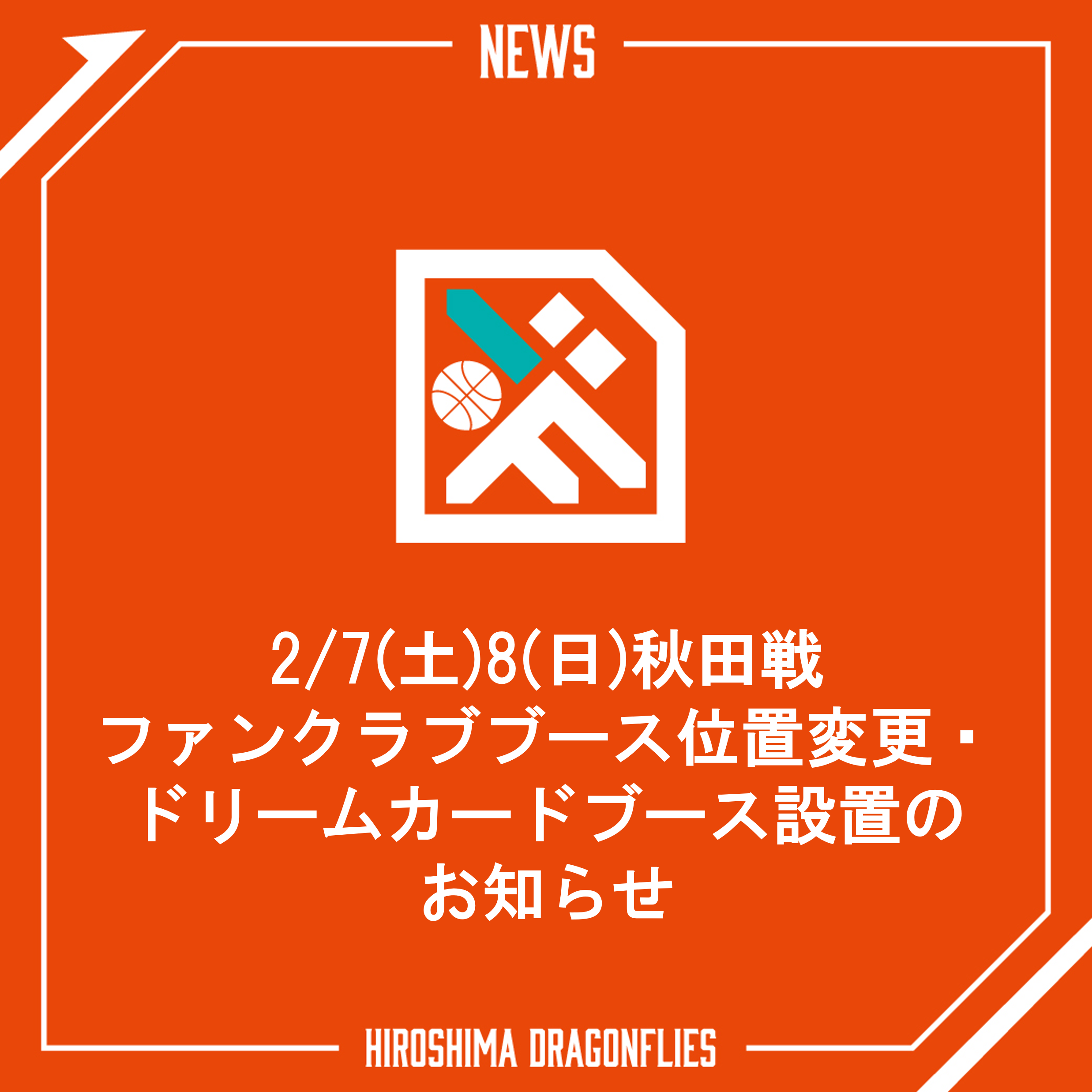 2/7(土)8(日)秋田戦 ファンクラブブース位置変更・ドリームカードブース設置のお知らせ