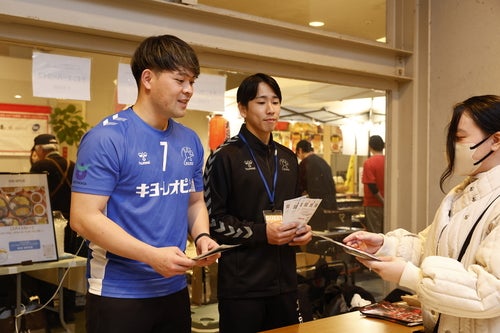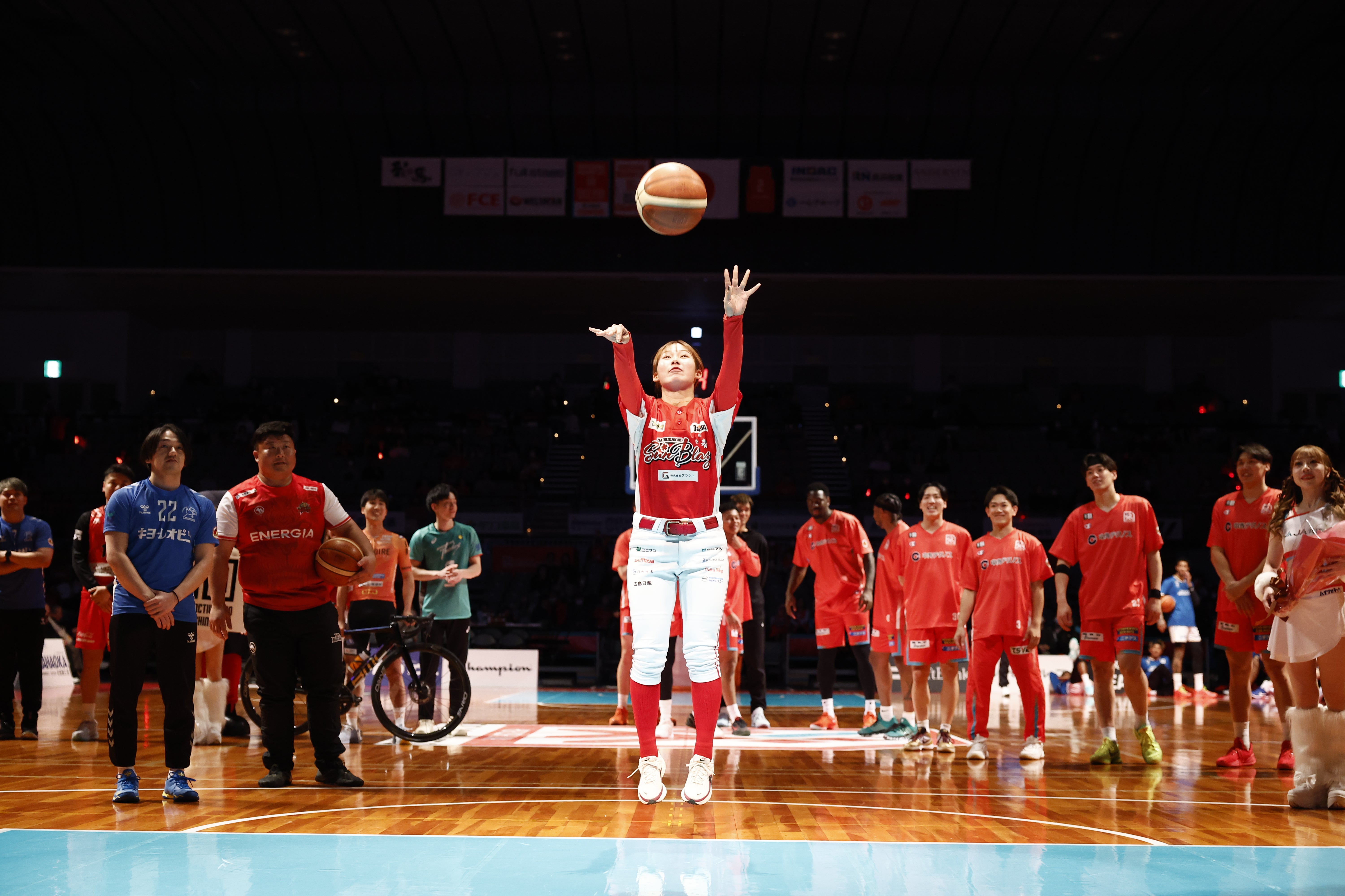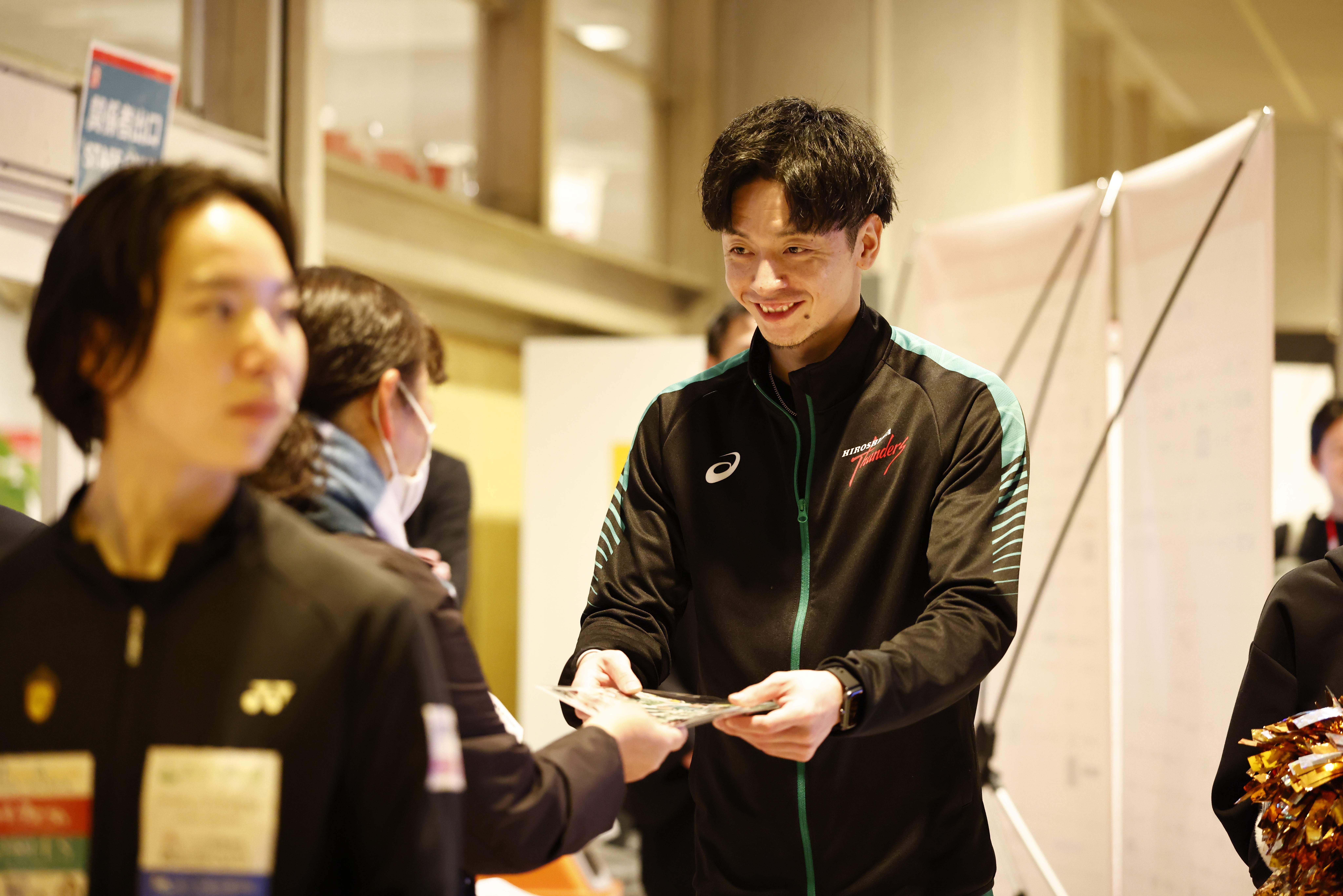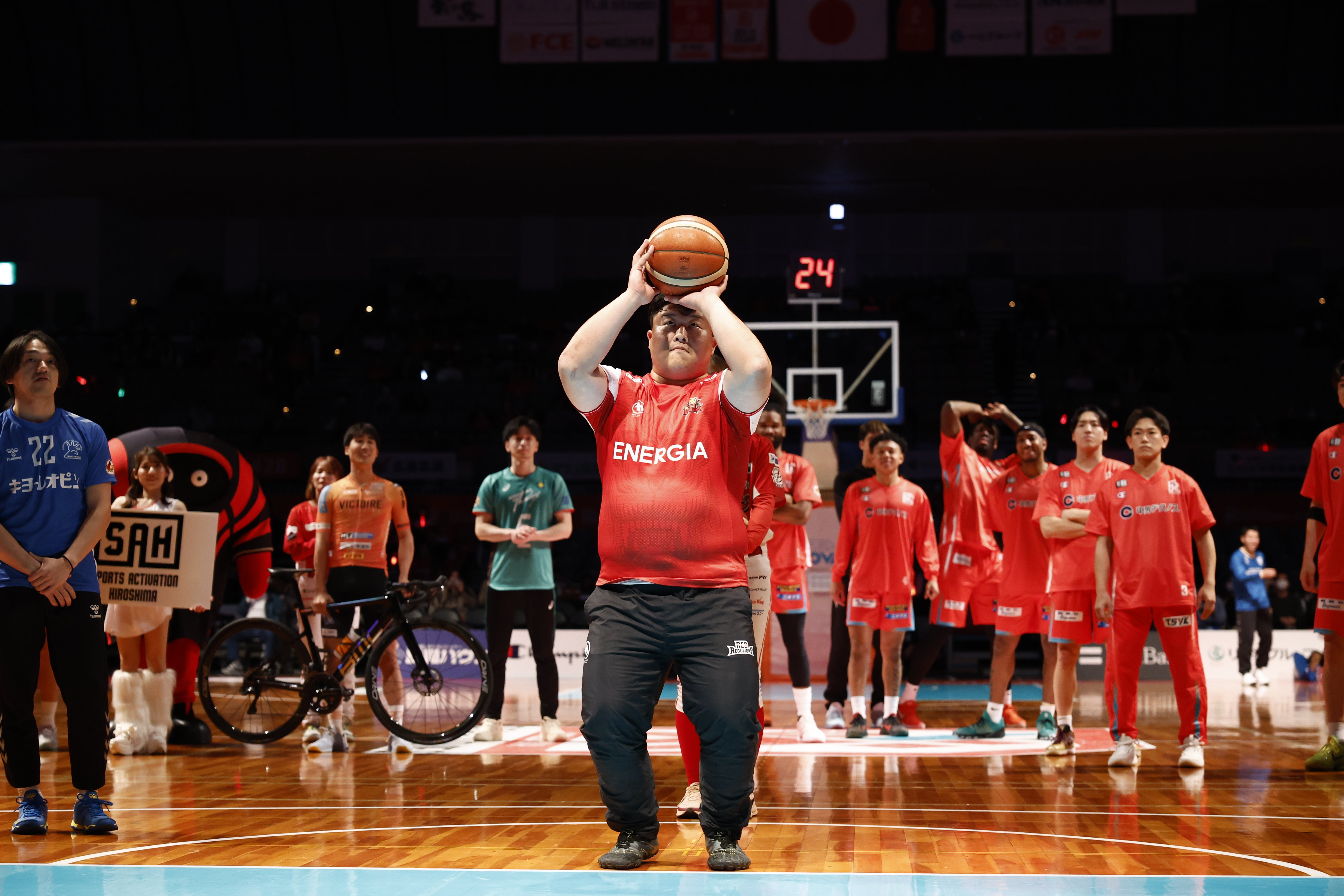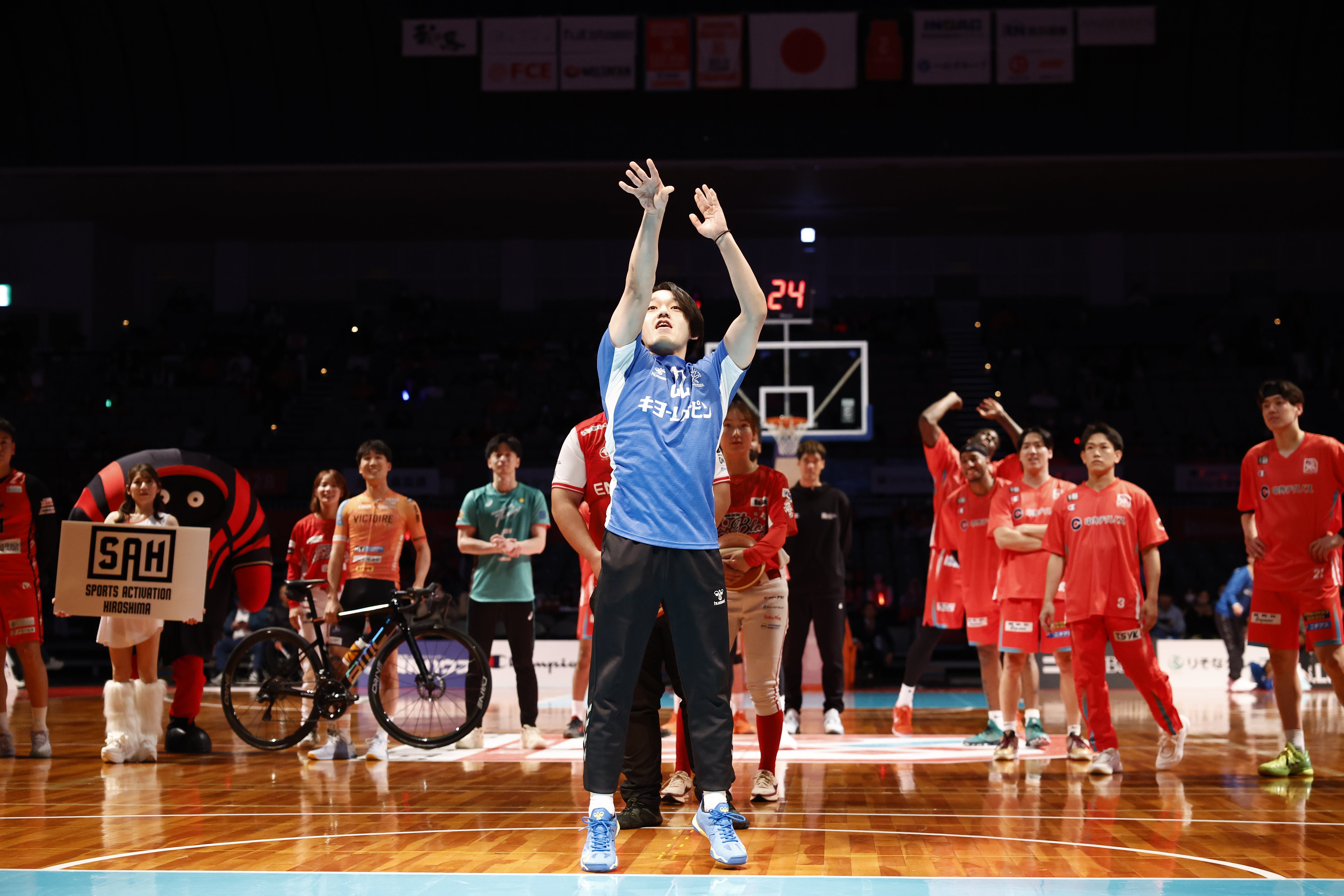 ハーフタイムでは、広島を拠点に全国、そして世界の舞台で活躍するトップアスリートである"どんぐり北広島ソフトテニスクラブ 岩倉彩佳 選手""ヴィクトワール広島 白川幸希 選手""広島サンダーズ キャプテン 井上慎一朗 選手"によるチームPRを行いました。また、各選手によるサインボール投げ込みを行いました。