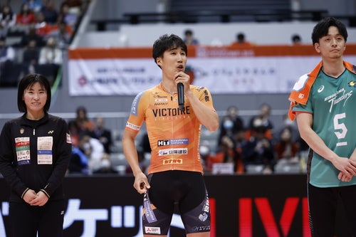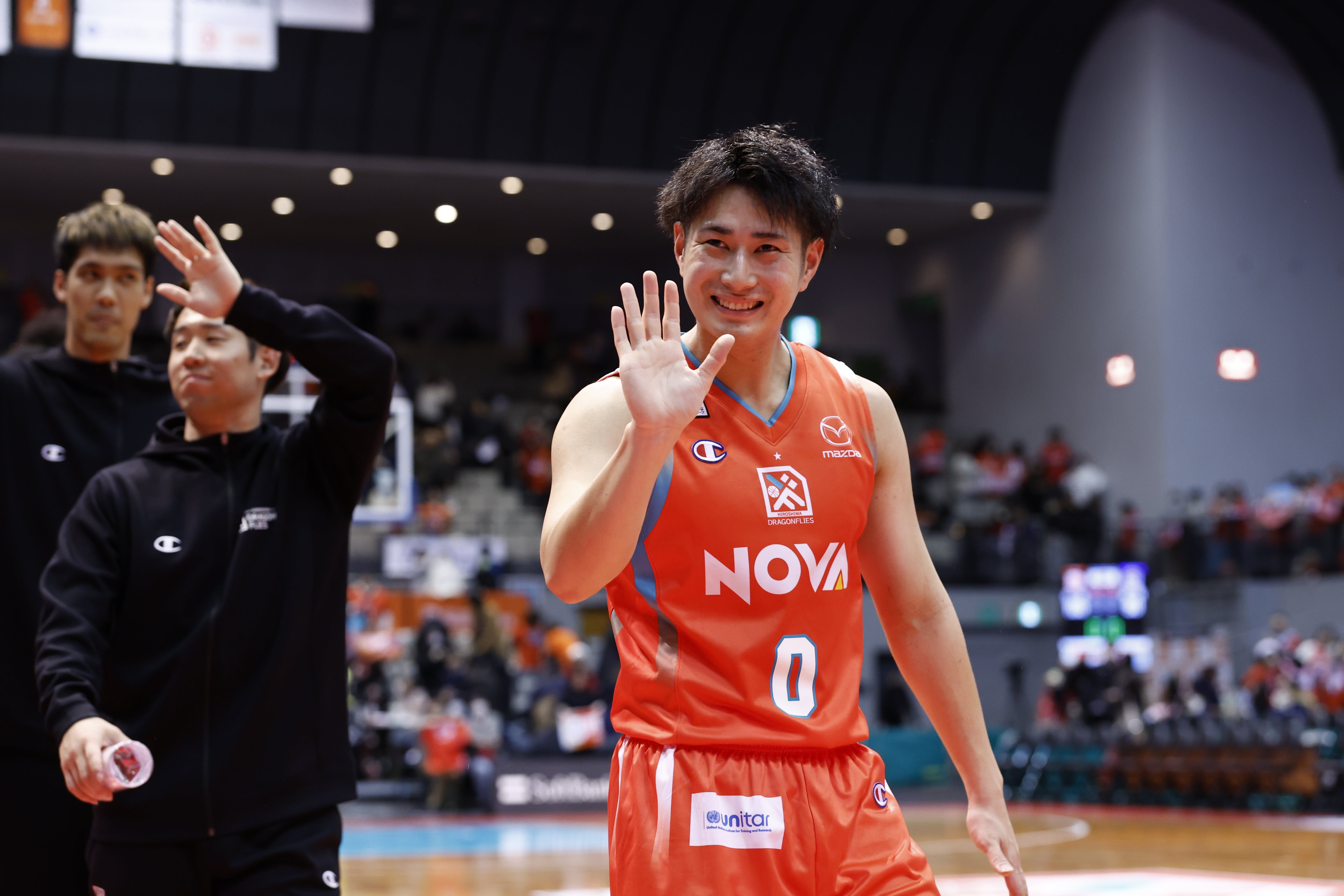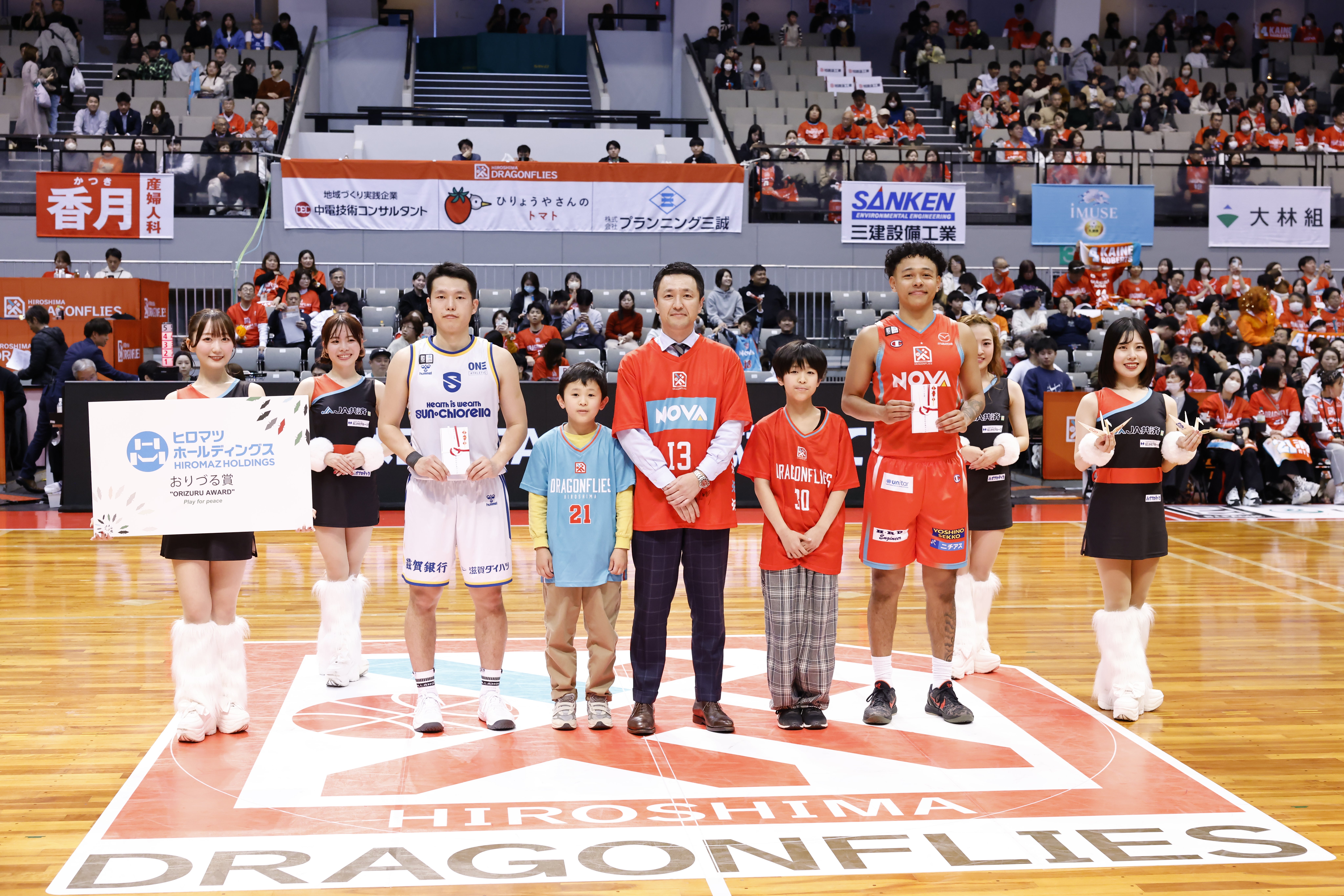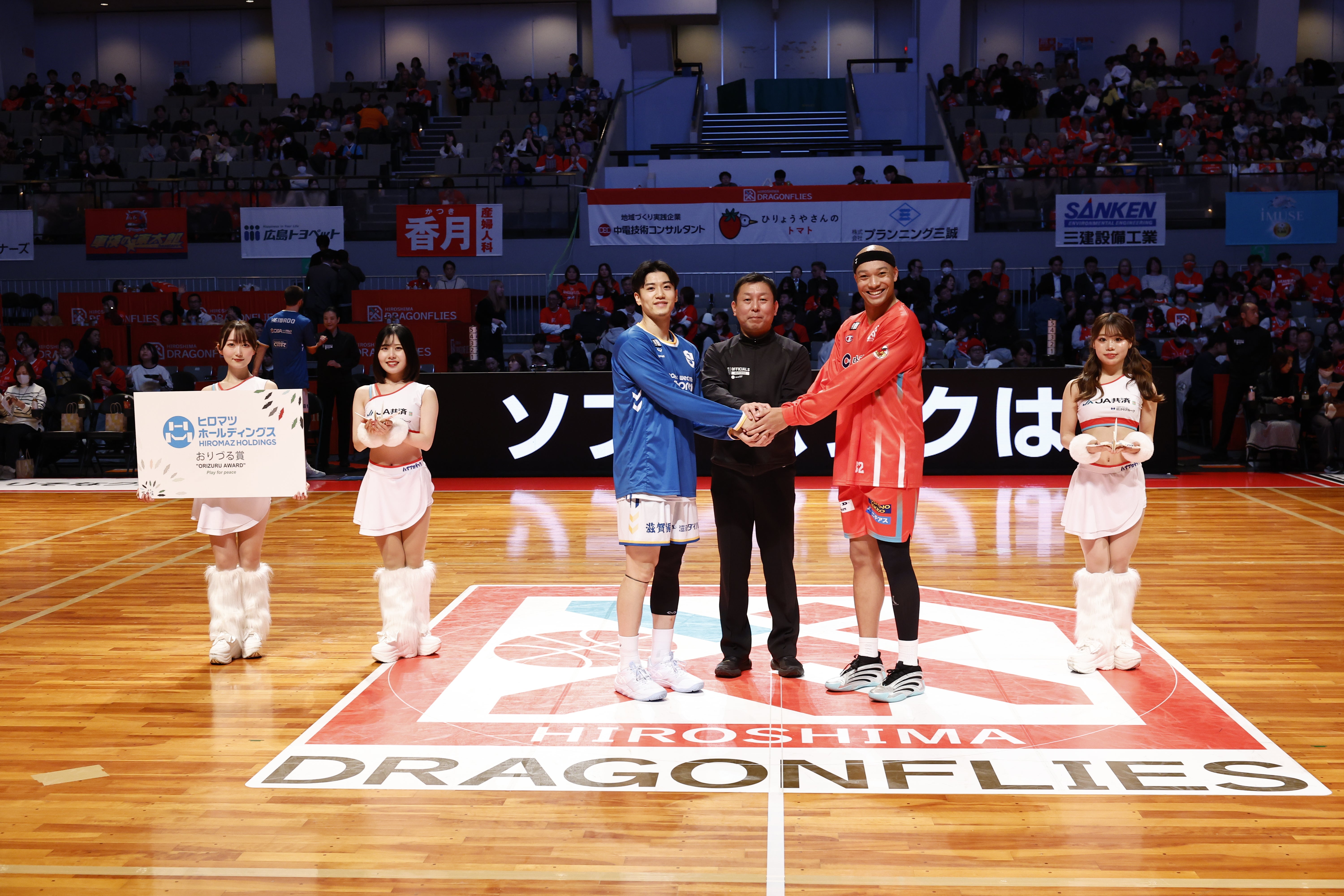 試合開始前には、両チームのキャプテンによるおりづる交換が行われました。試合を通して最もリスペクトに値する選手を表彰する「ヒロマツホールディングス presents おりづる賞」は、広島ドラゴンフライズ ロバーツ ケイン 選手、滋賀レイクス 岡田泰希 選手が受賞しました。
