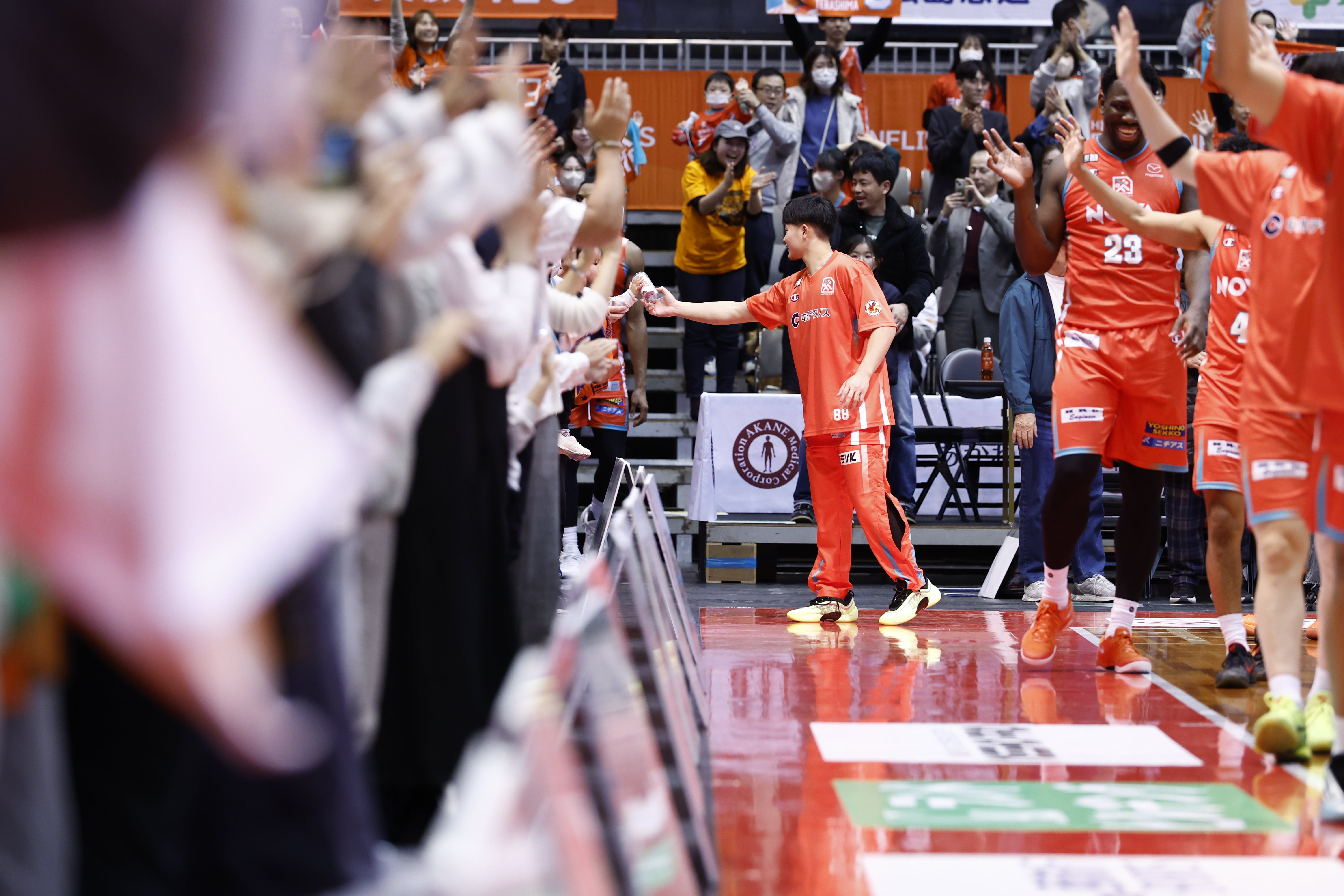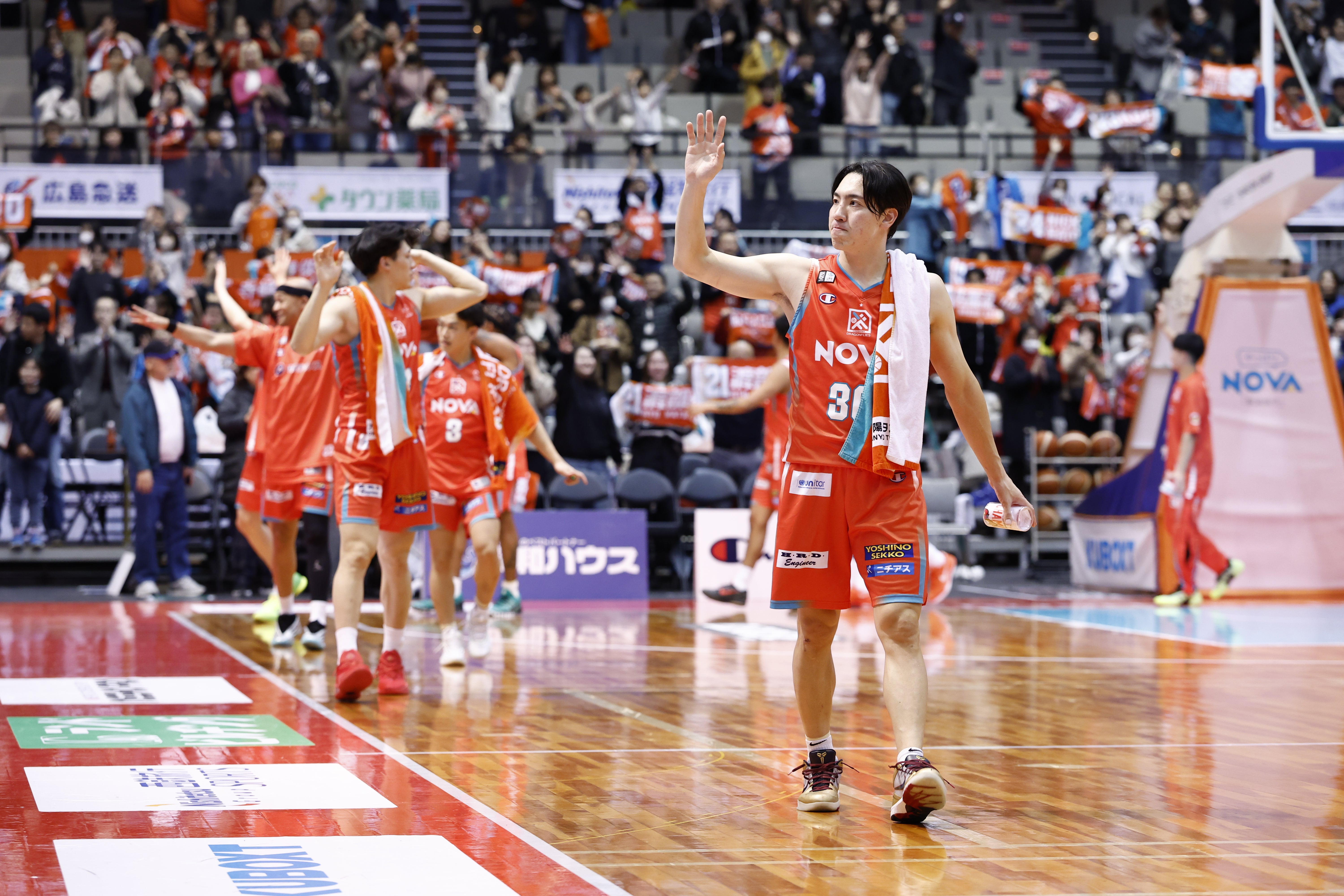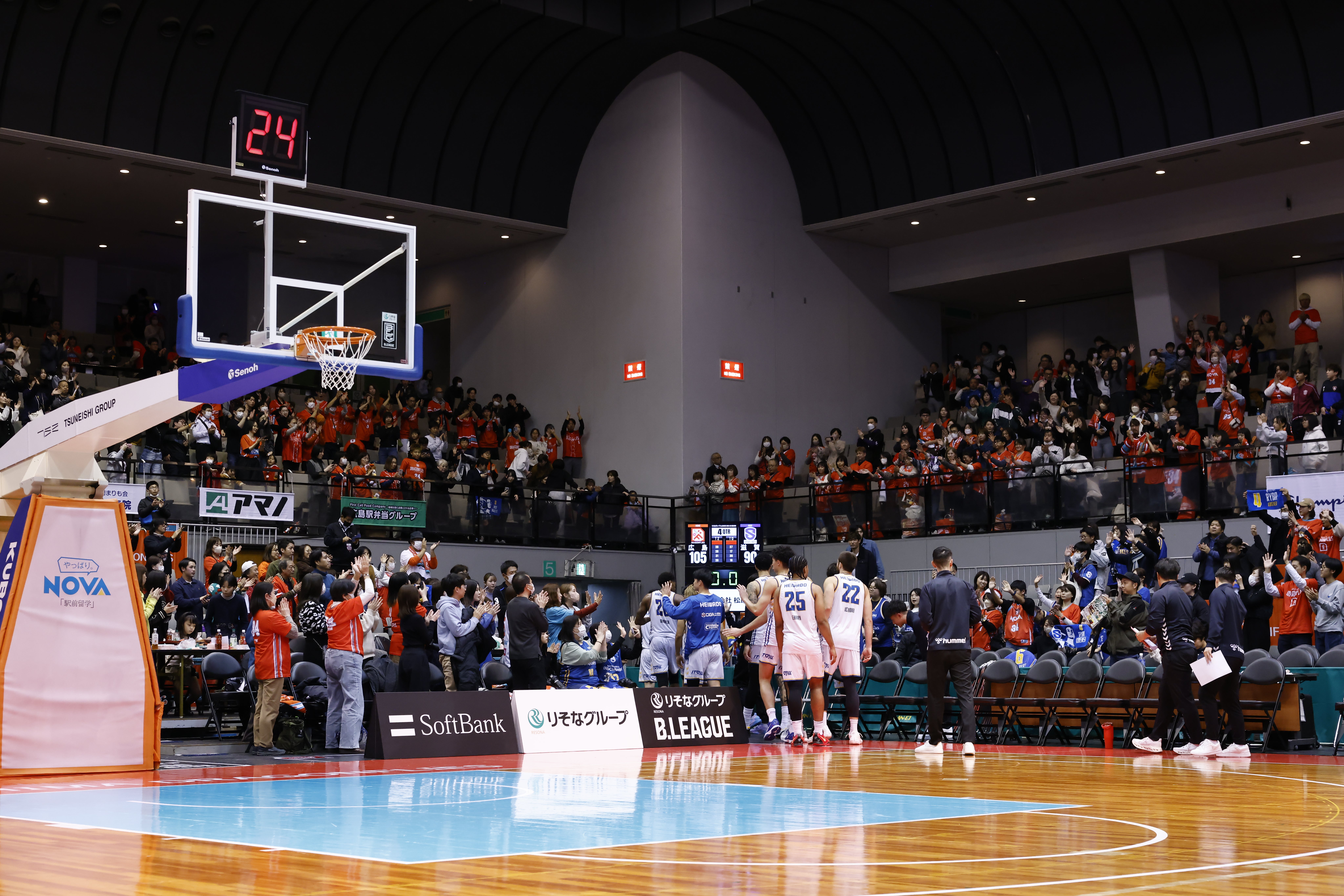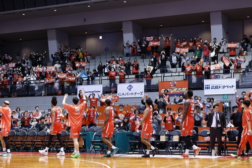広島ドラゴンフライズは、熱い戦いを繰り広げてくれたアウェイチームへリスペクトを込めて、スタンディングオベーションでお送りしています。
