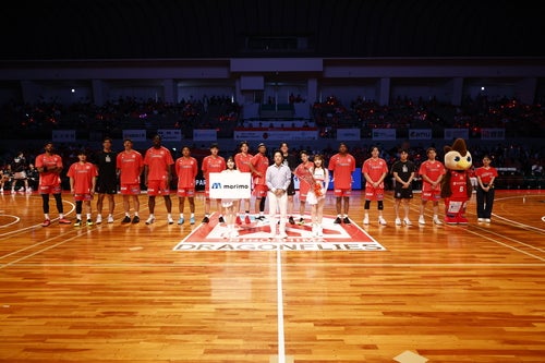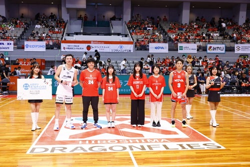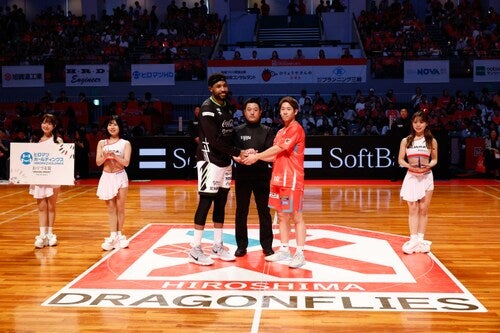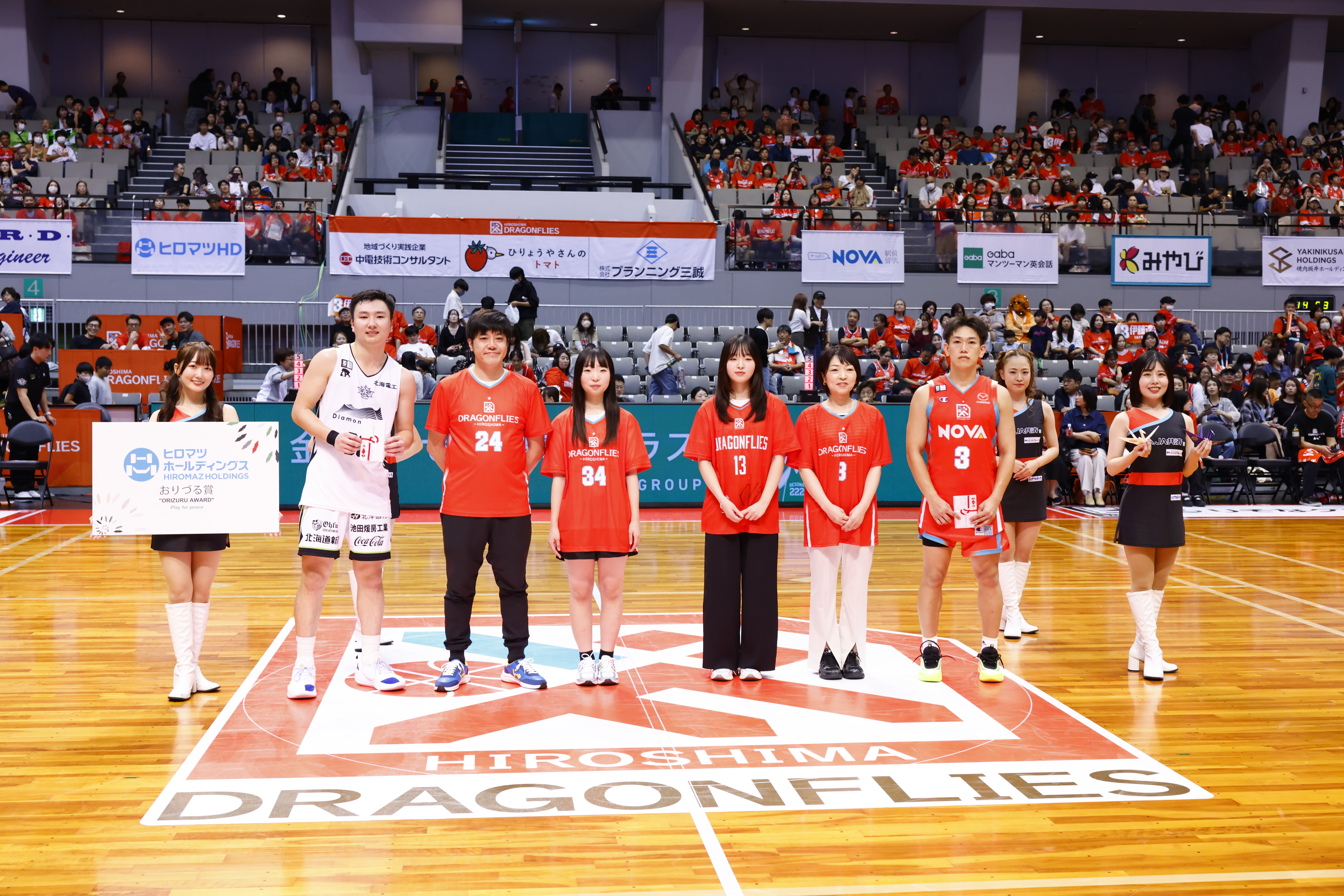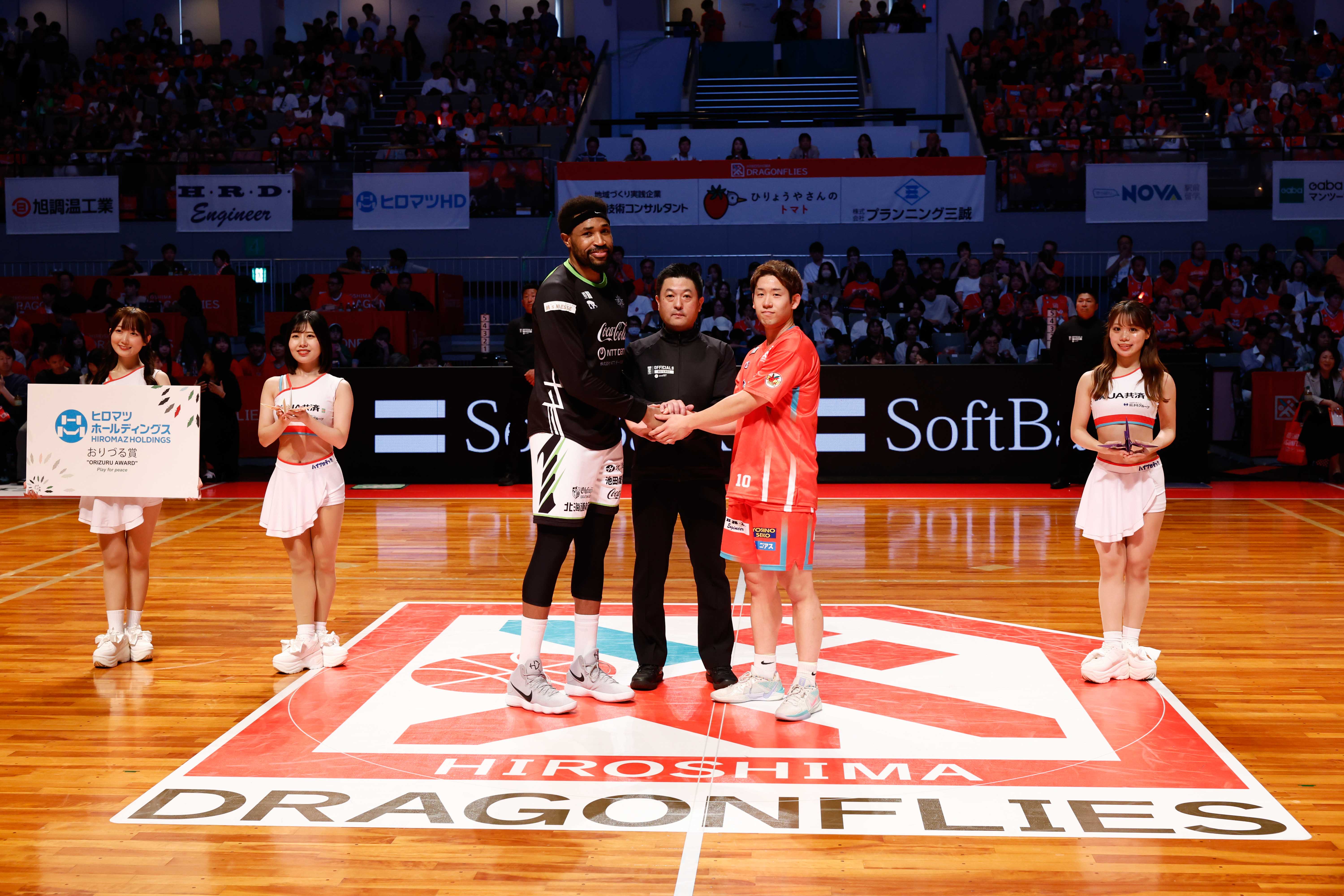 試合開始前には、両チームのキャプテンによるおりづる交換が行われました。試合を通して最もリスペクトに値する選手を表彰する「ヒロマツホールディングス presents おりづる賞」は、広島ドラゴンフライズ 伊藤達哉 選手、レバンガ北海道 富永啓生 選手が受賞しました。