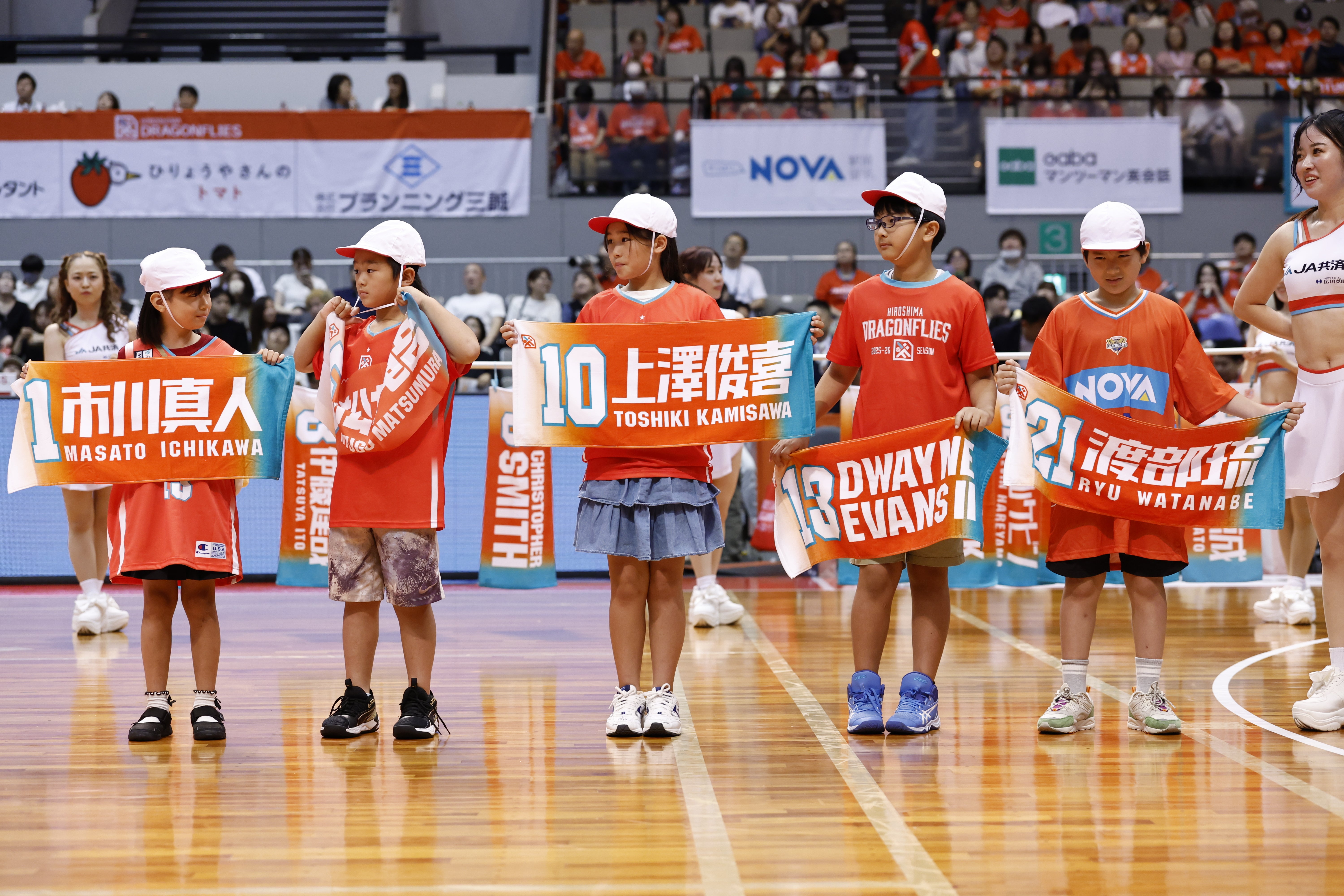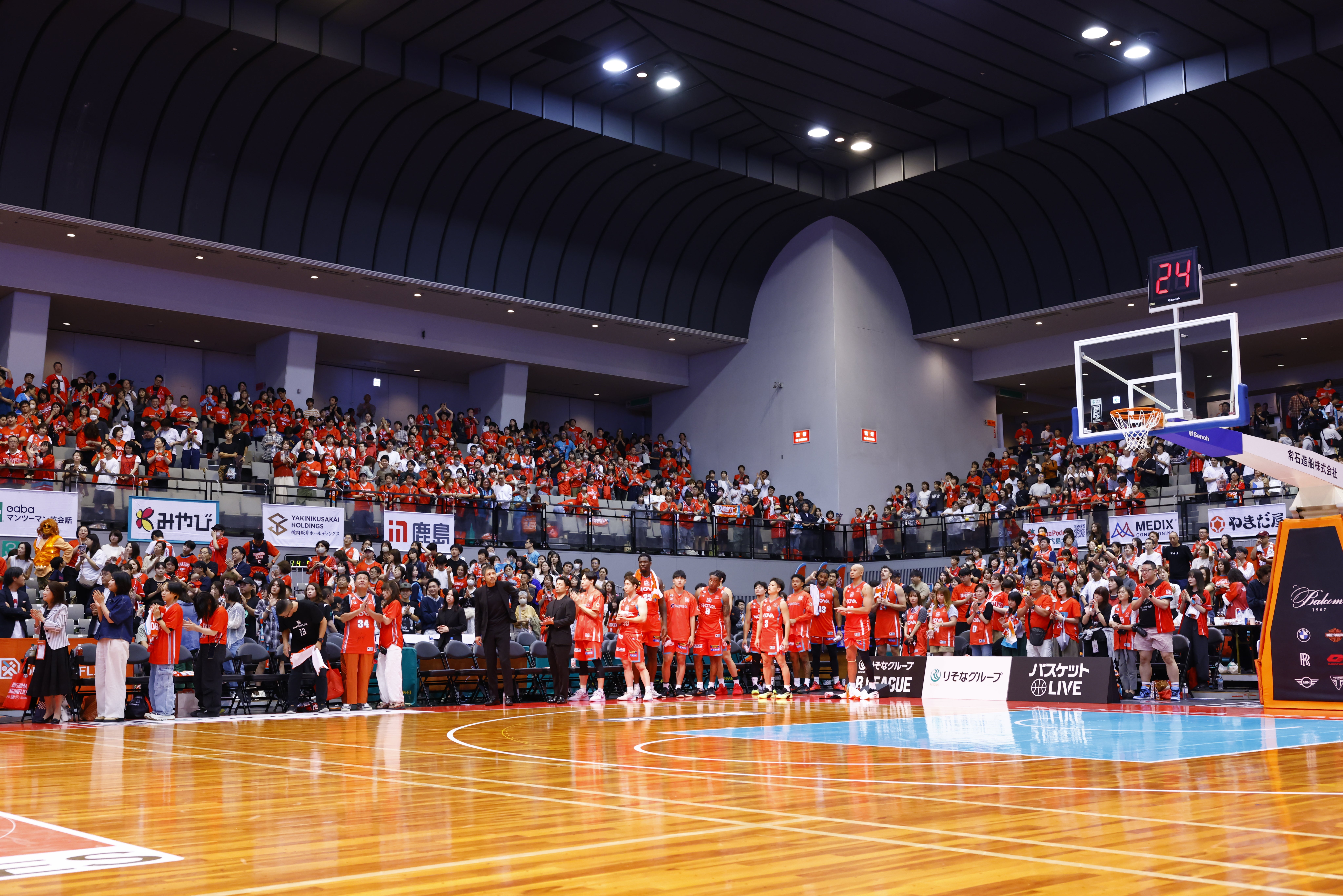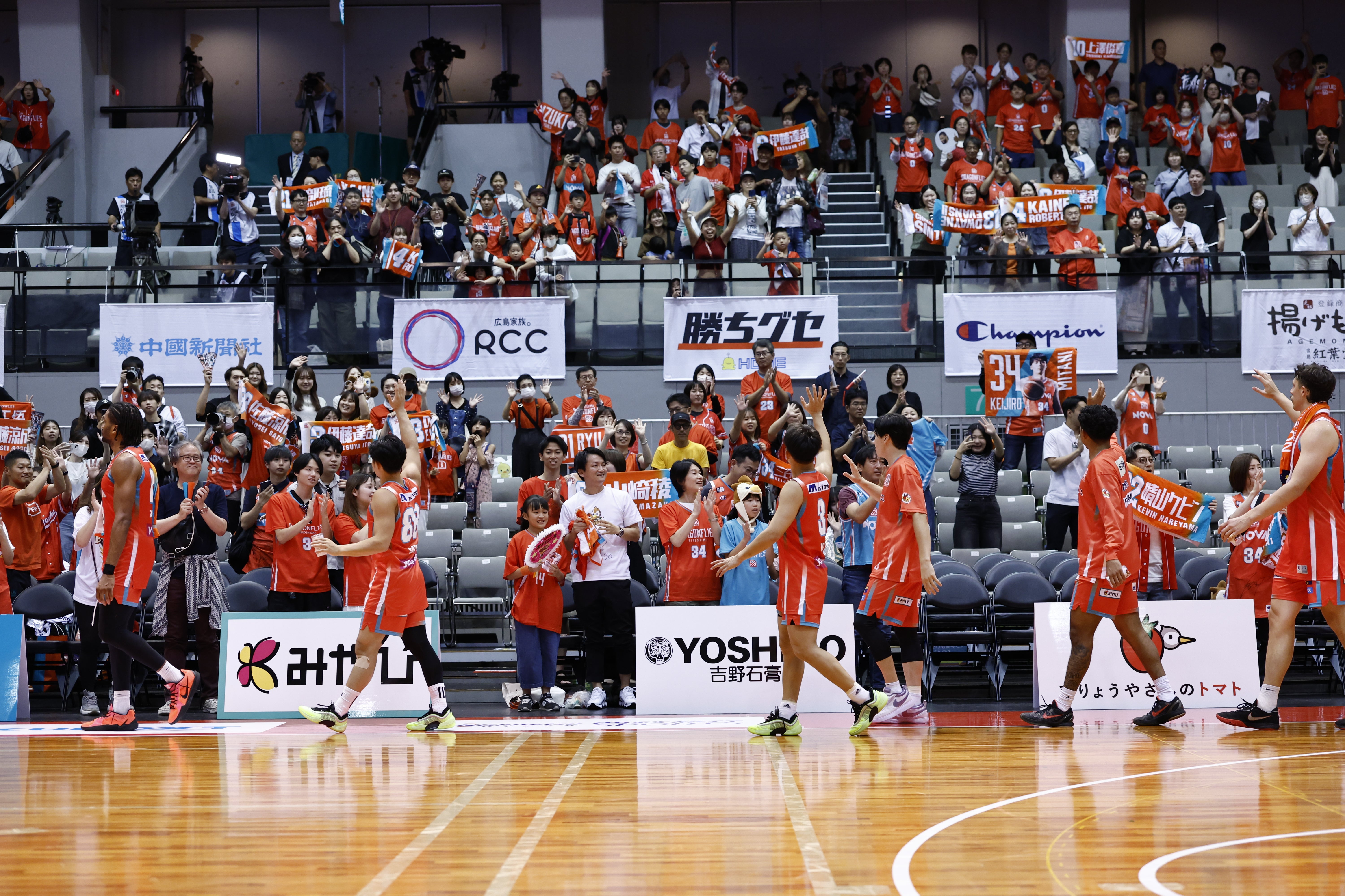 広島ドラゴンフライズは、熱い戦いを繰り広げてくれたアウェイチームへリスペクトを込めて、スタンディングオベーションでお送りしています。