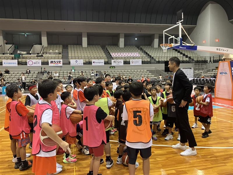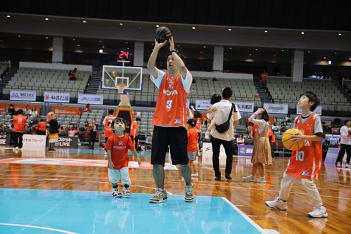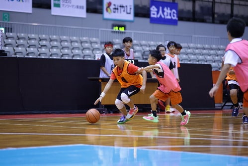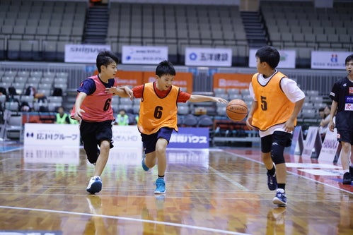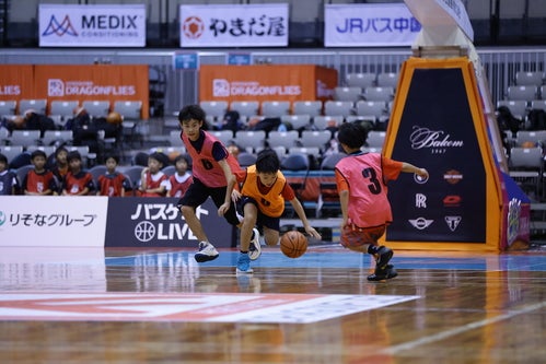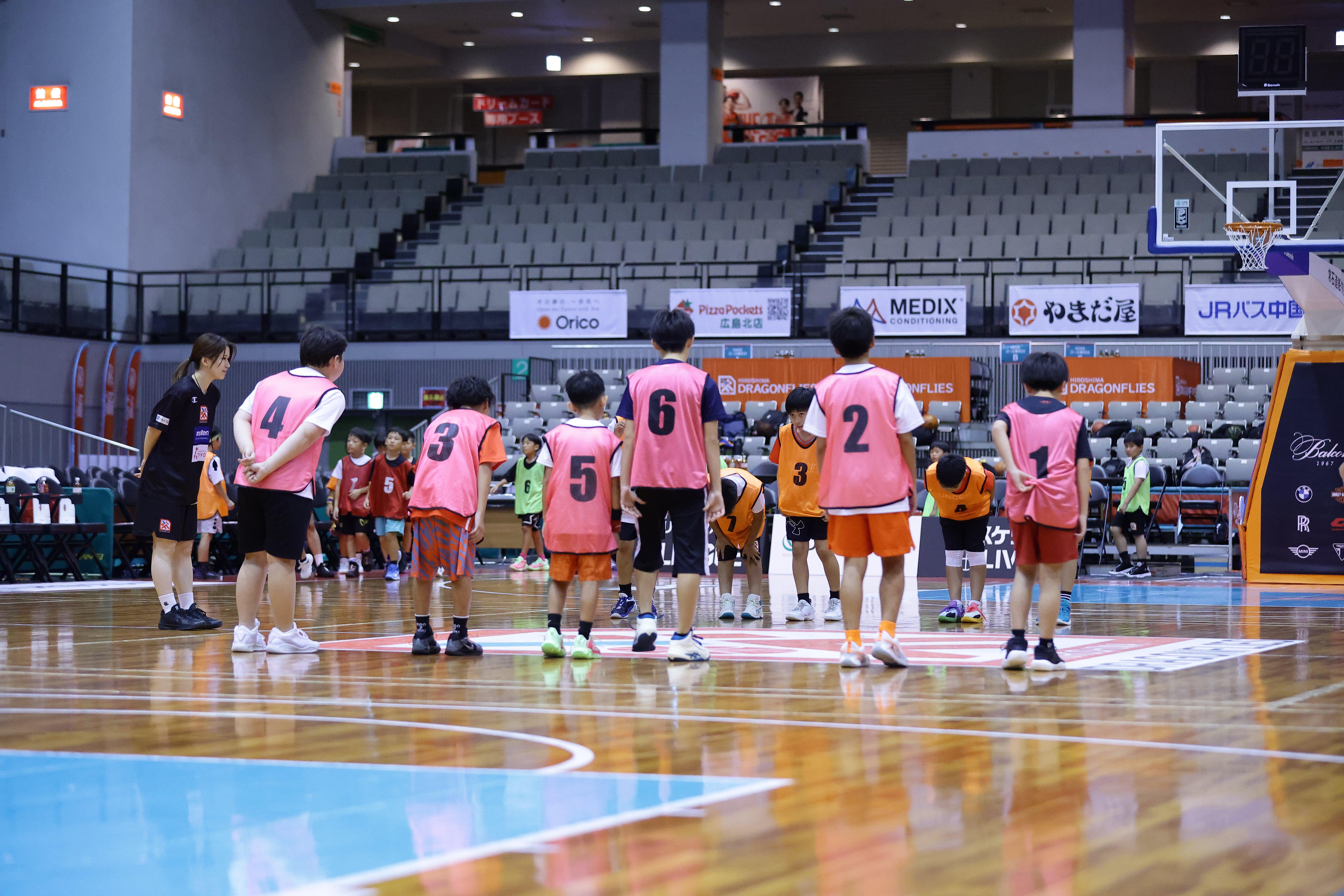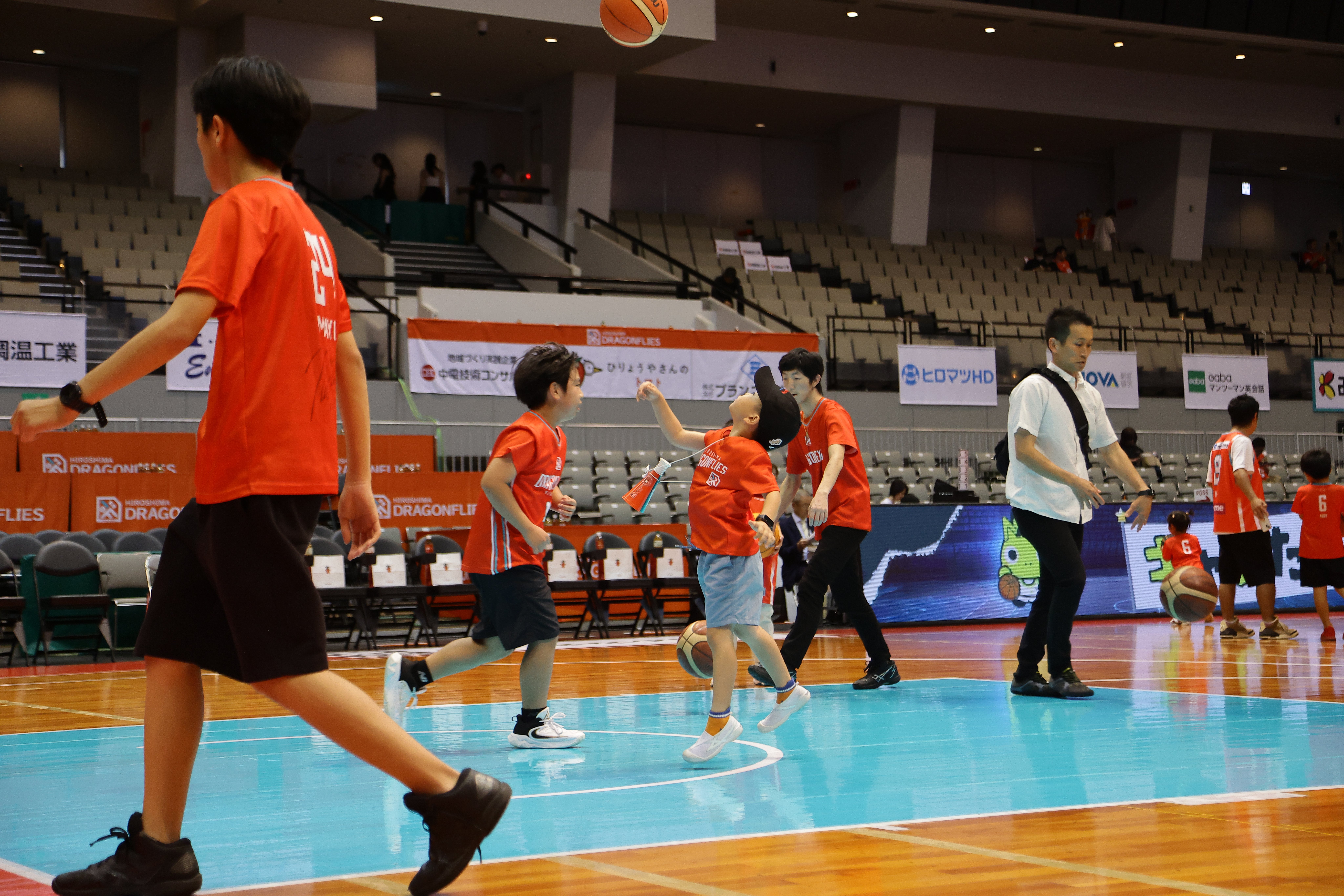 試合後には、小学生を対象にプロ選手が試合をするコートを使用した「広島ドラゴンフライズ ミニスクールカップ」を開催しました。