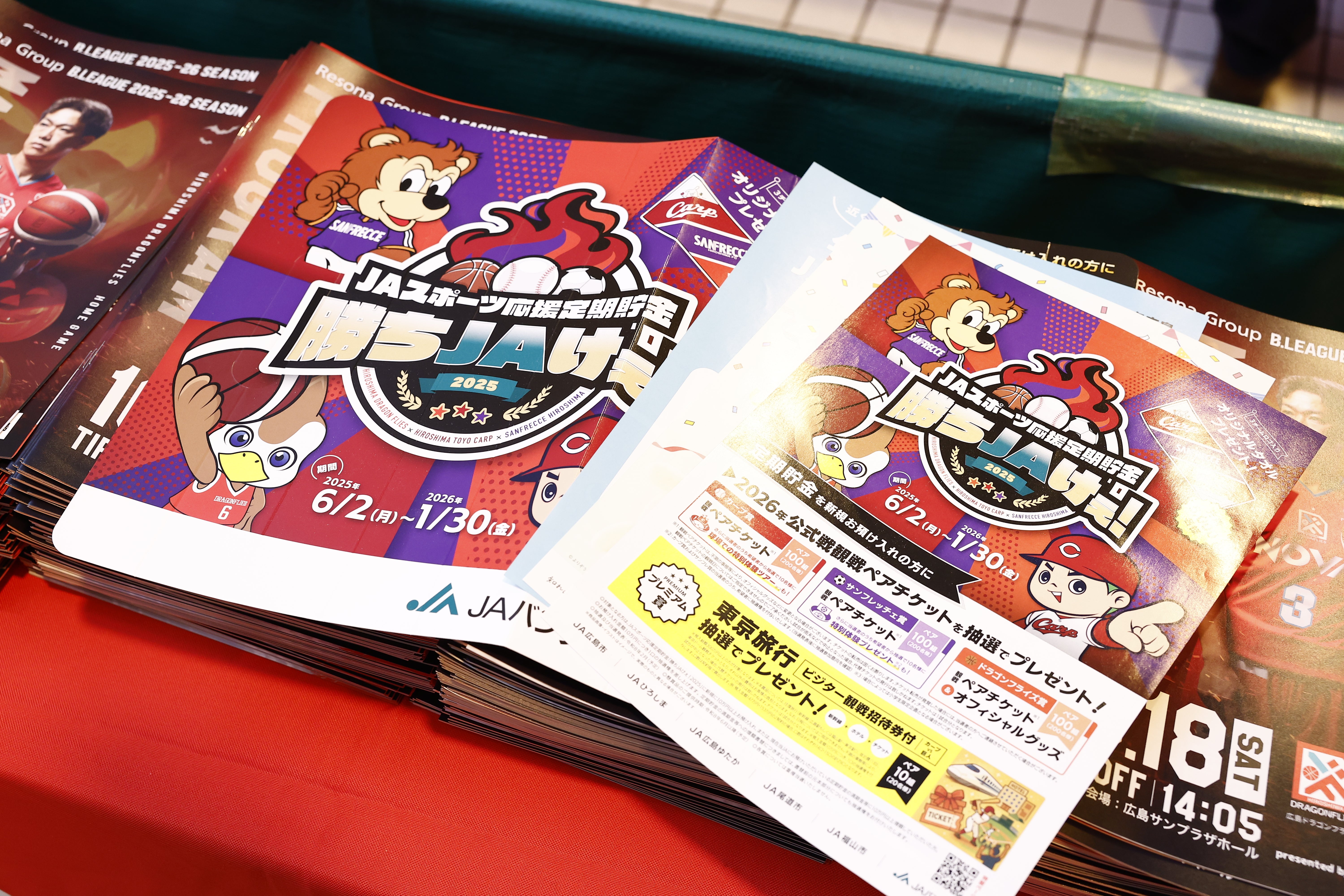 JAバンク広島より、オリジナルデザインの応援ハリセンと豪華景品があたるQRコード付きのキャンペーンチラシが配布されました。