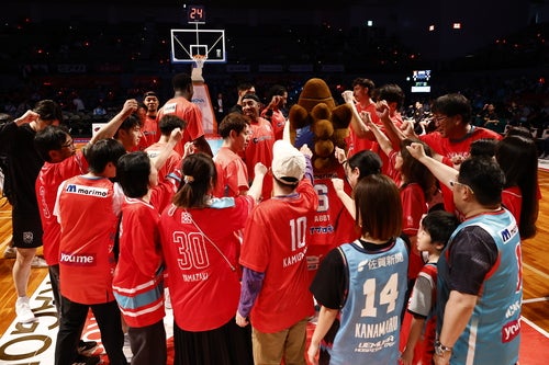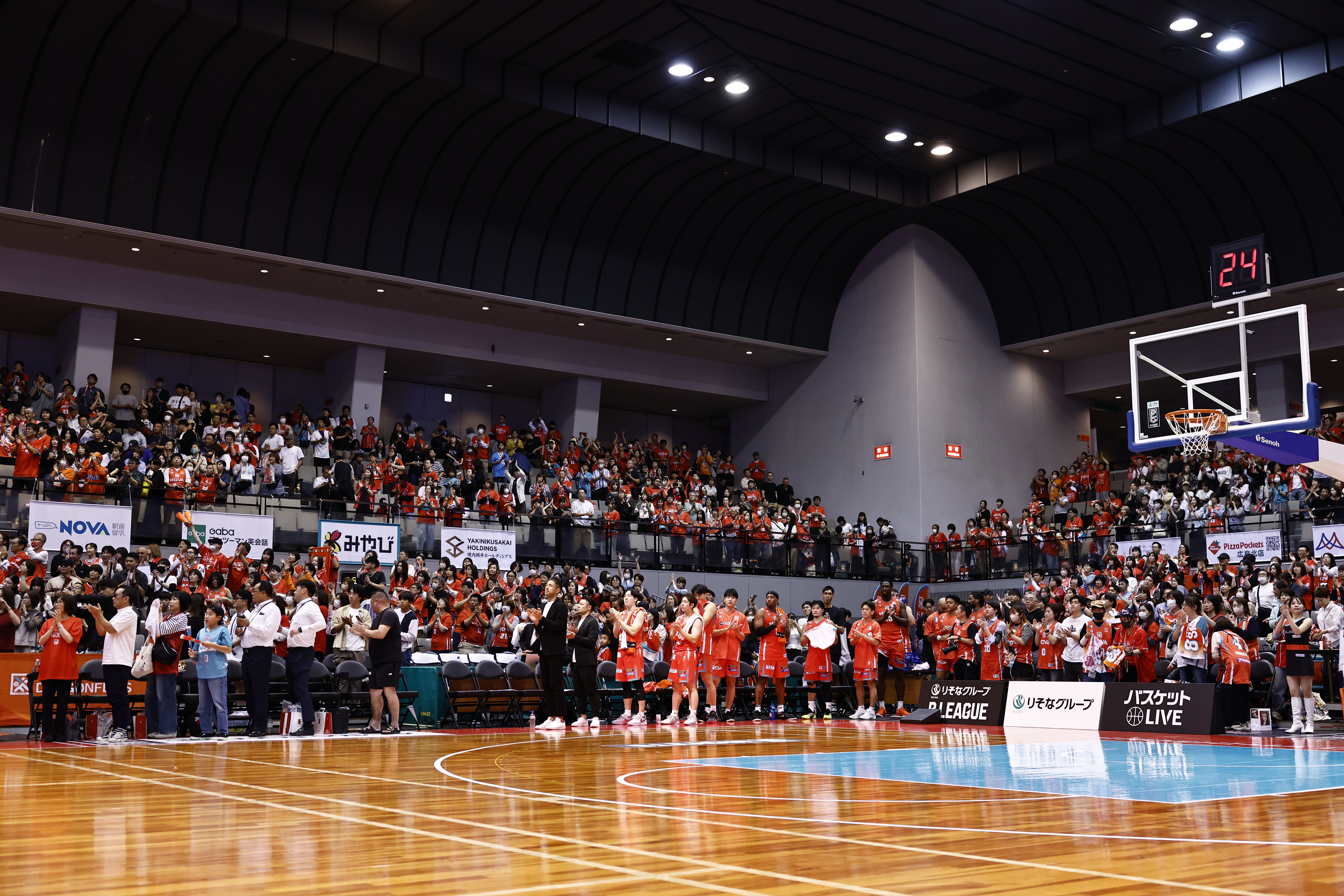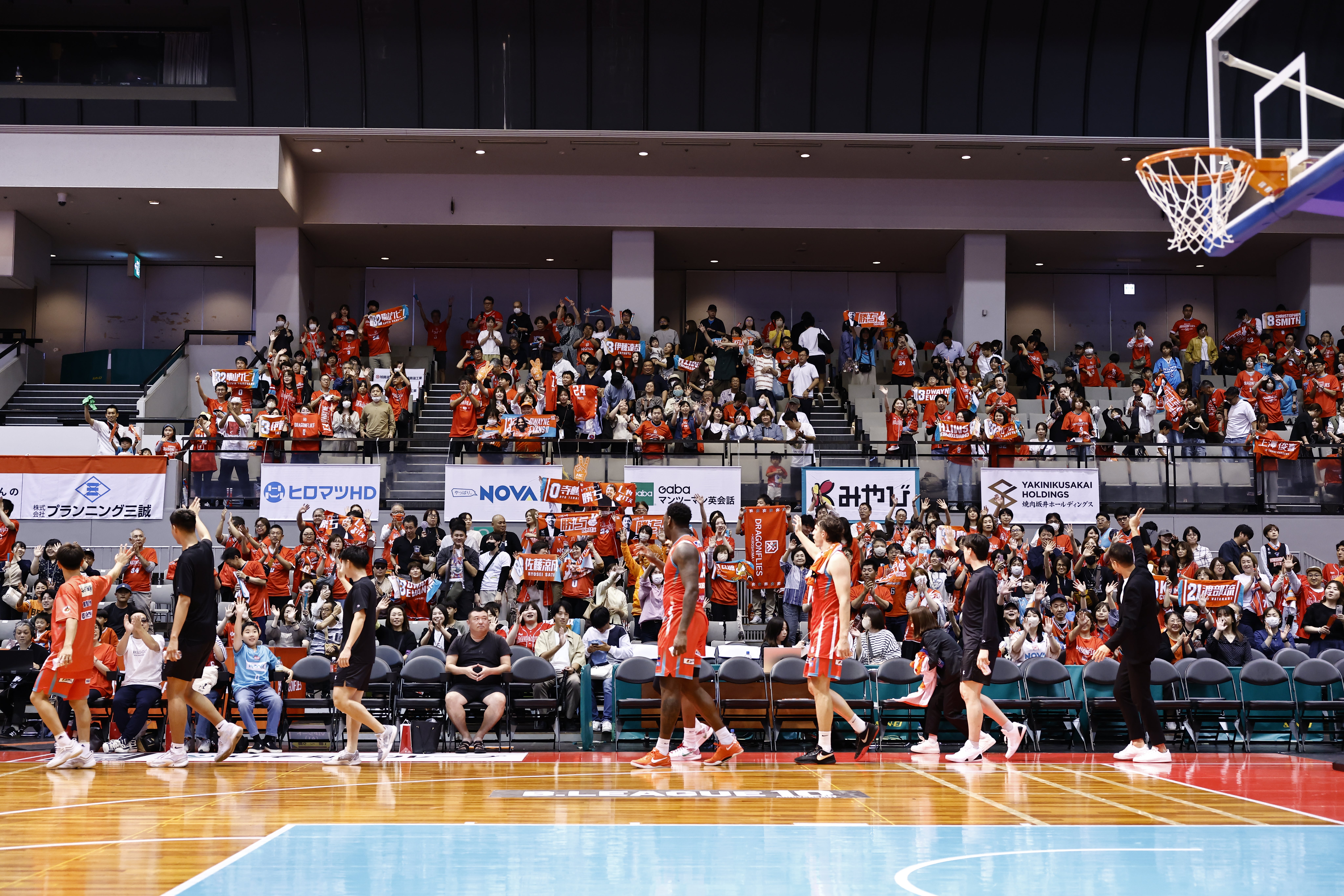 広島ドラゴンフライズは、熱い戦いを繰り広げてくれたアウェイチームへリスペクトを込めて、スタンディングオベーションでお送りしています。