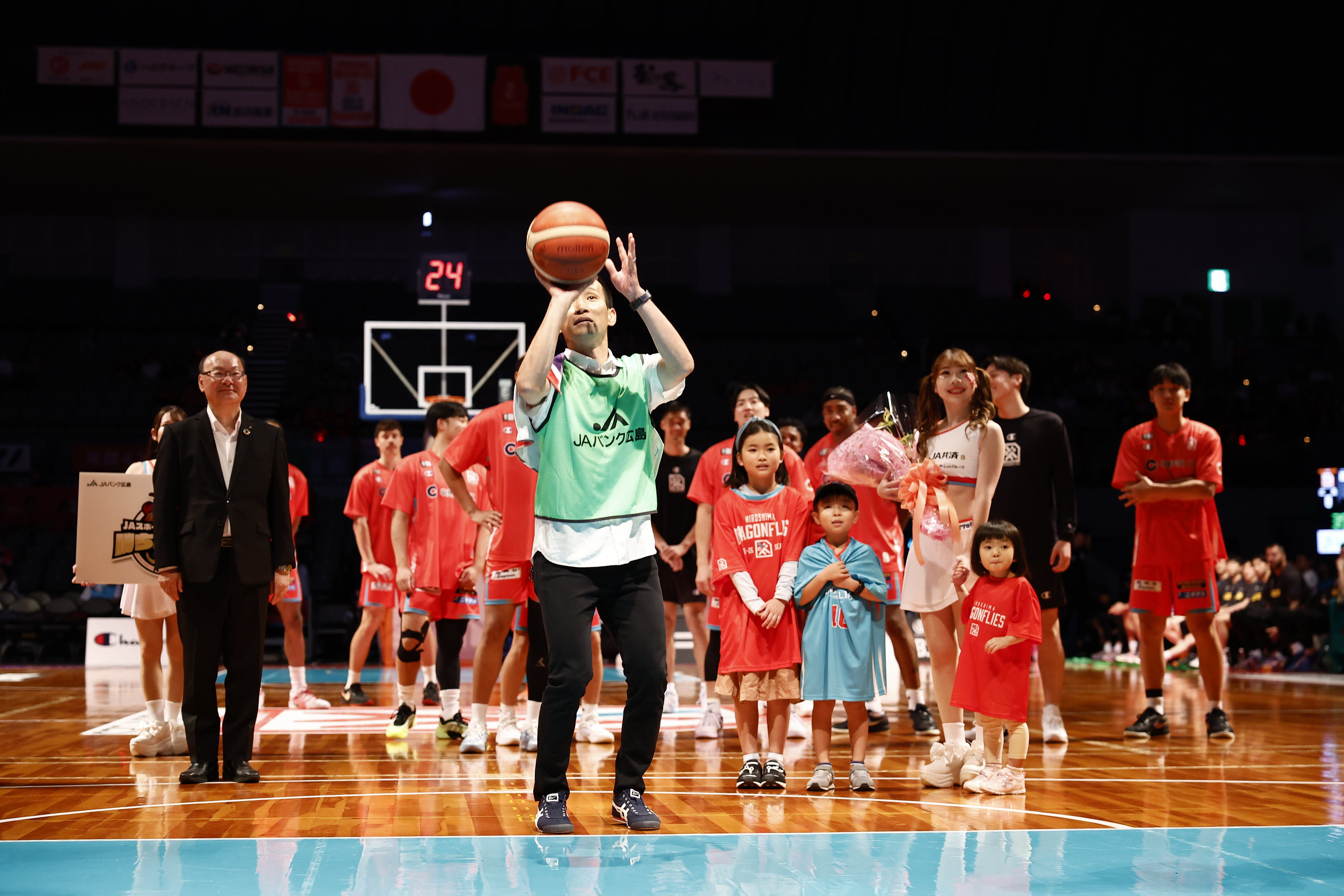 フリースローセレモニーは、広島県信用農業協同組合連合会 事務システム部 菅田慎一 様に実施いただきました。