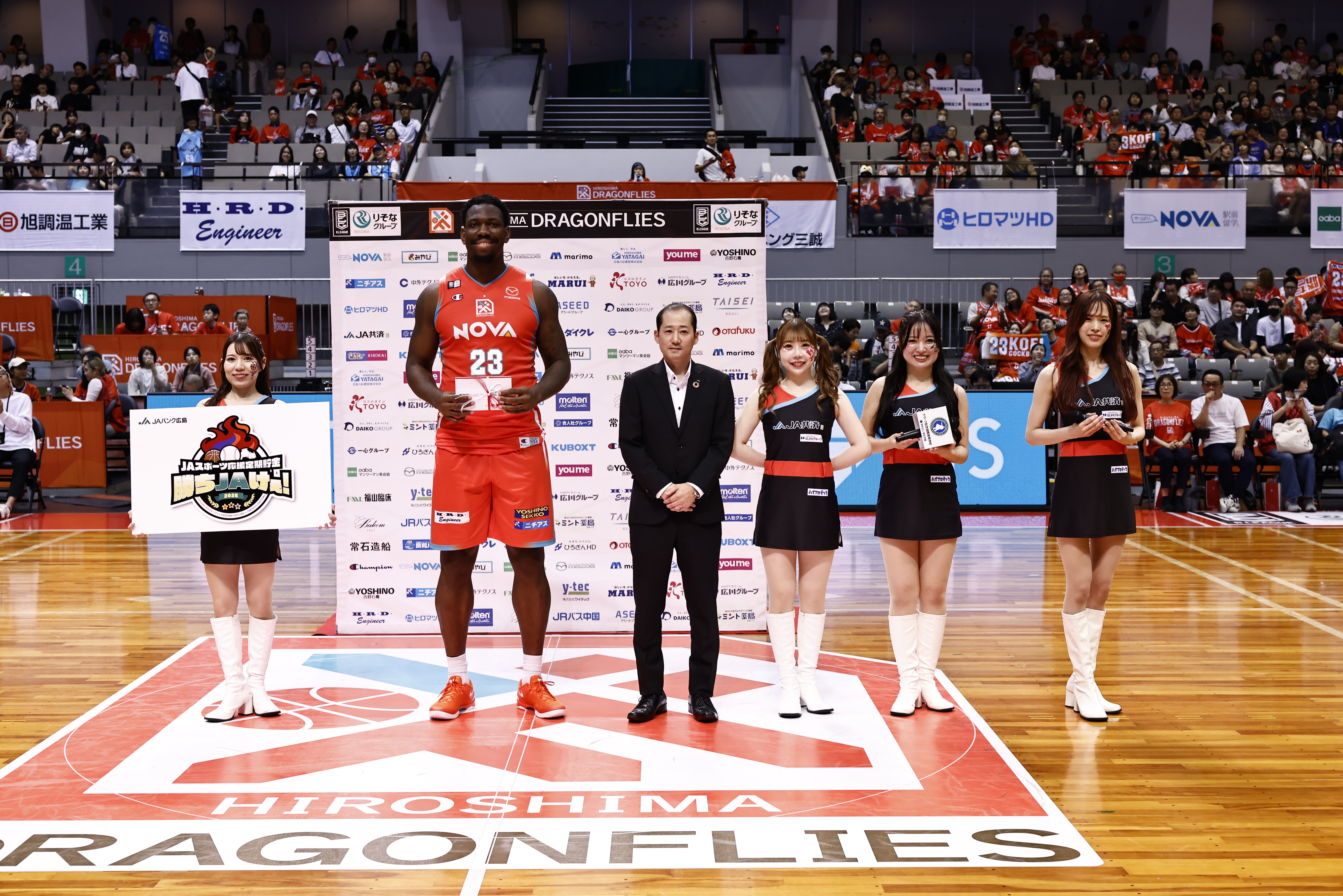 JAバンク広島 presents MOM賞は コフィ・コーバーン 選手が受賞しました。広島県信用農業協同組合連合会 JAバンク推進部 部長 山根昌之 様より、「広島県産あきろまん」が贈呈されました。