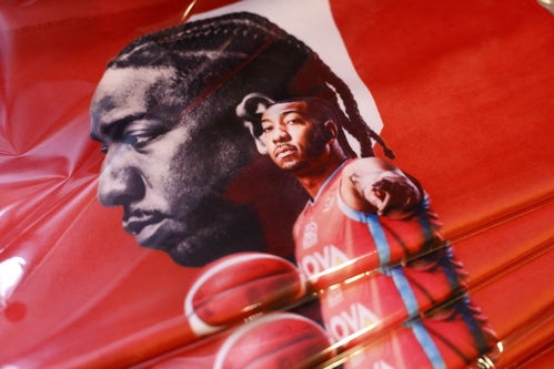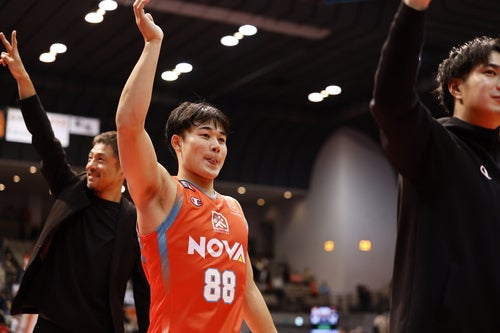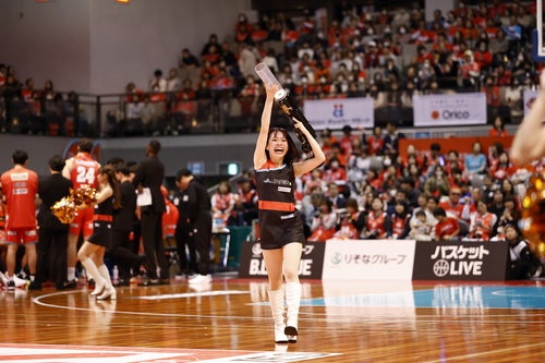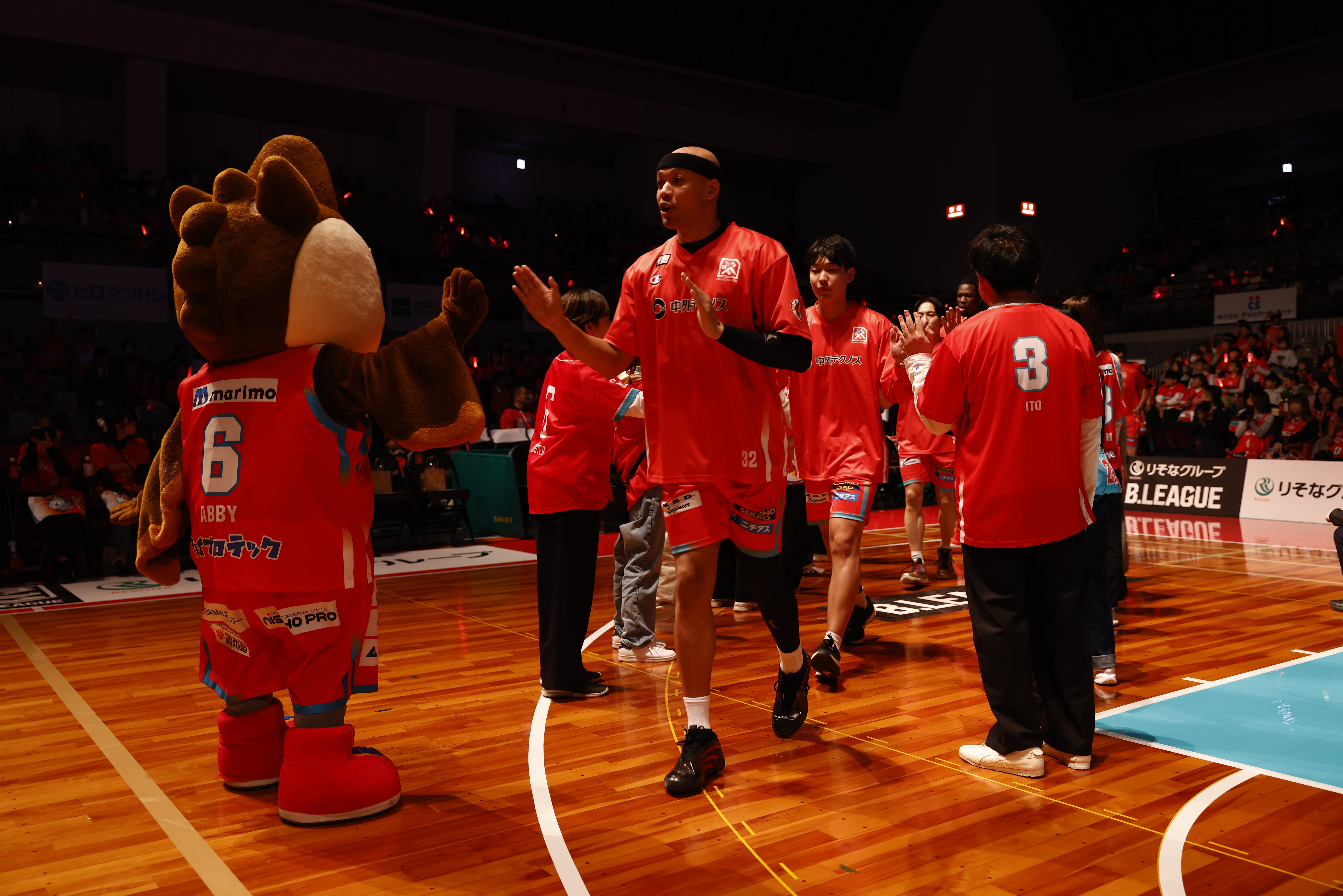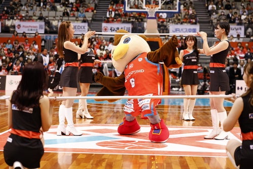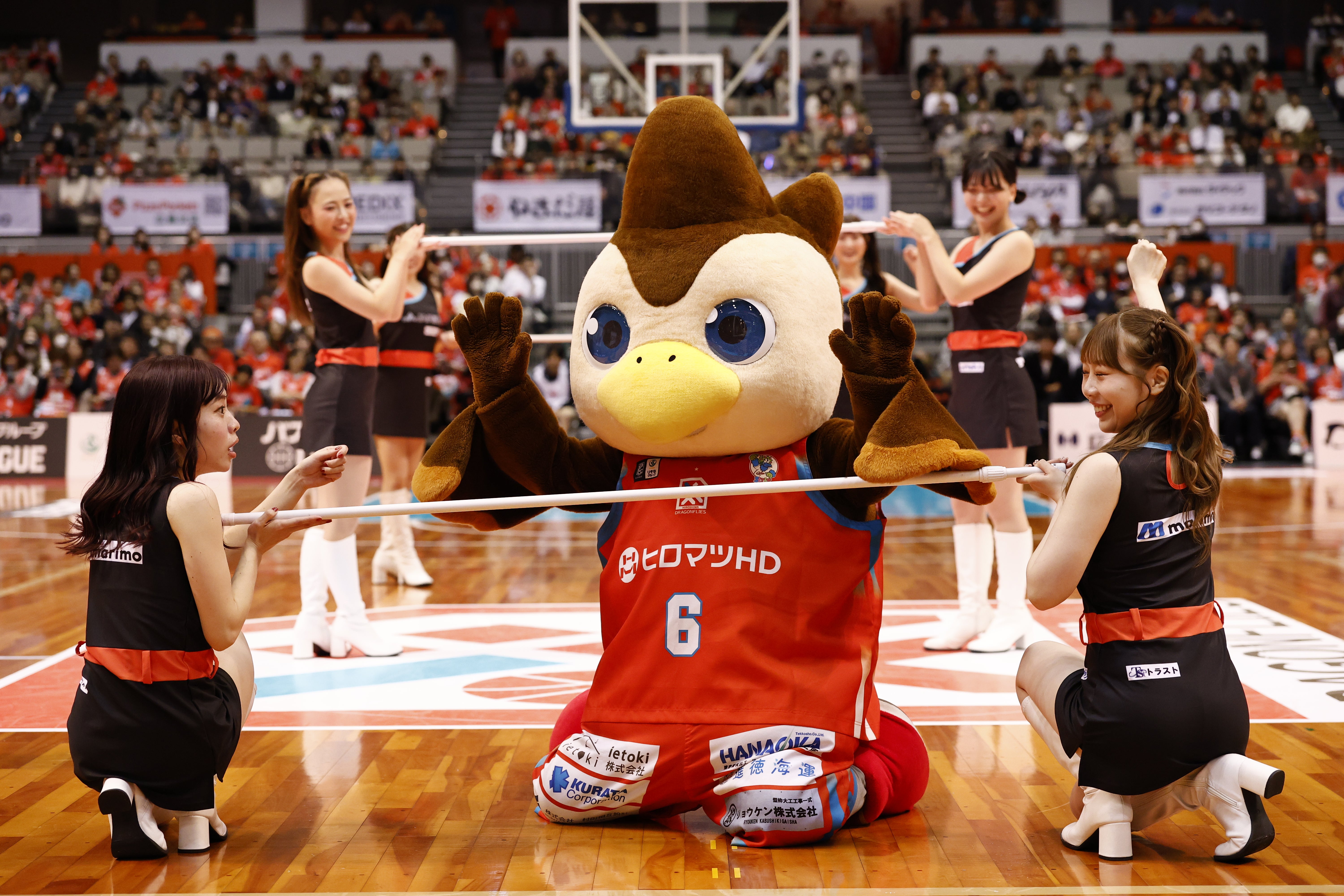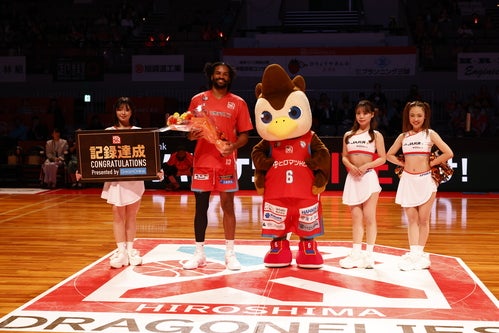 10/26(日)大阪エヴェッサ戦で、ドウェイン・エバンス選手が"B1個人通算1,000アシスト"達成いたしました。達成を記念して、モヒカンアビィより花束が贈呈されました。