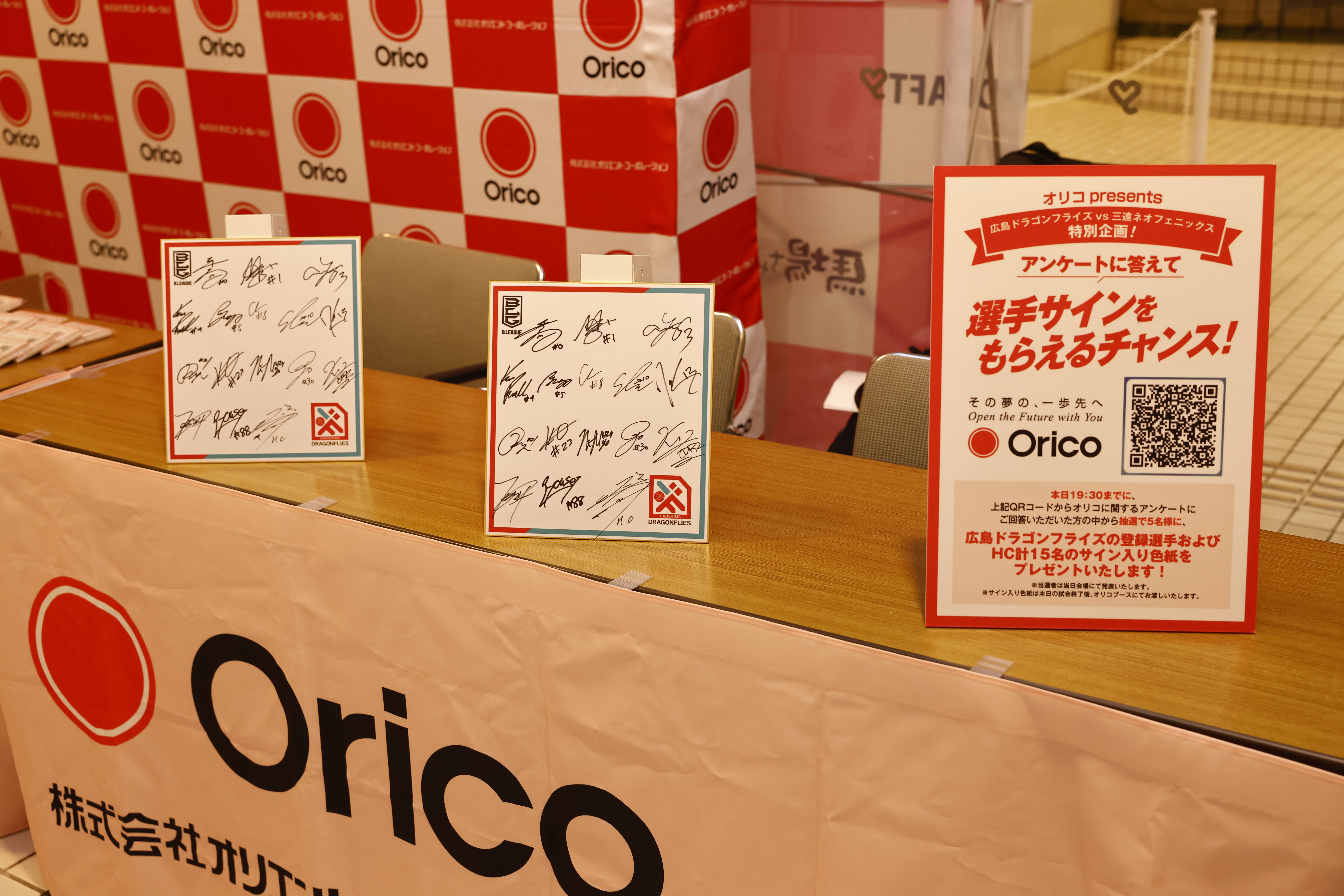オリコ特設ブースでは、ブースにお越しいただいた方々にポケットティッシュを配布いたしました。ポケットティッシュに記載のアンケートに答えていただいた方の中から抽選で5名の方に、広島ドラゴンフライズ選手のサイン入り色紙をプレゼントをいたしました。
