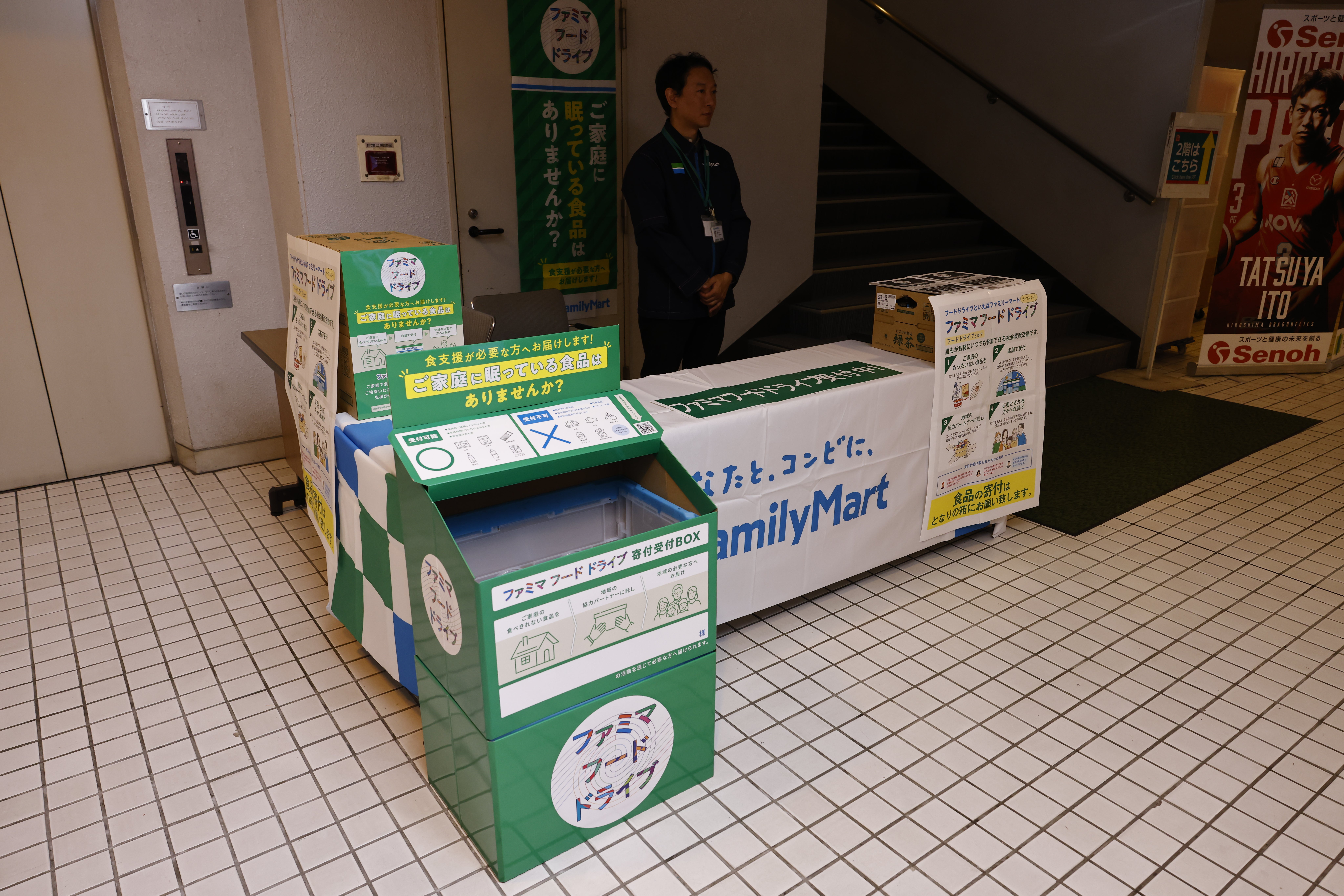 ファミリーマートのブースでは、ファミマフードドライブを実施いたしました。ブース横に食品回収BOXを設置し、ご家庭で食べきれない、未開封・常温保存可能な食品をお持ちいただきました。
