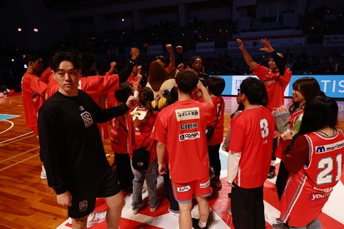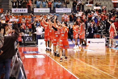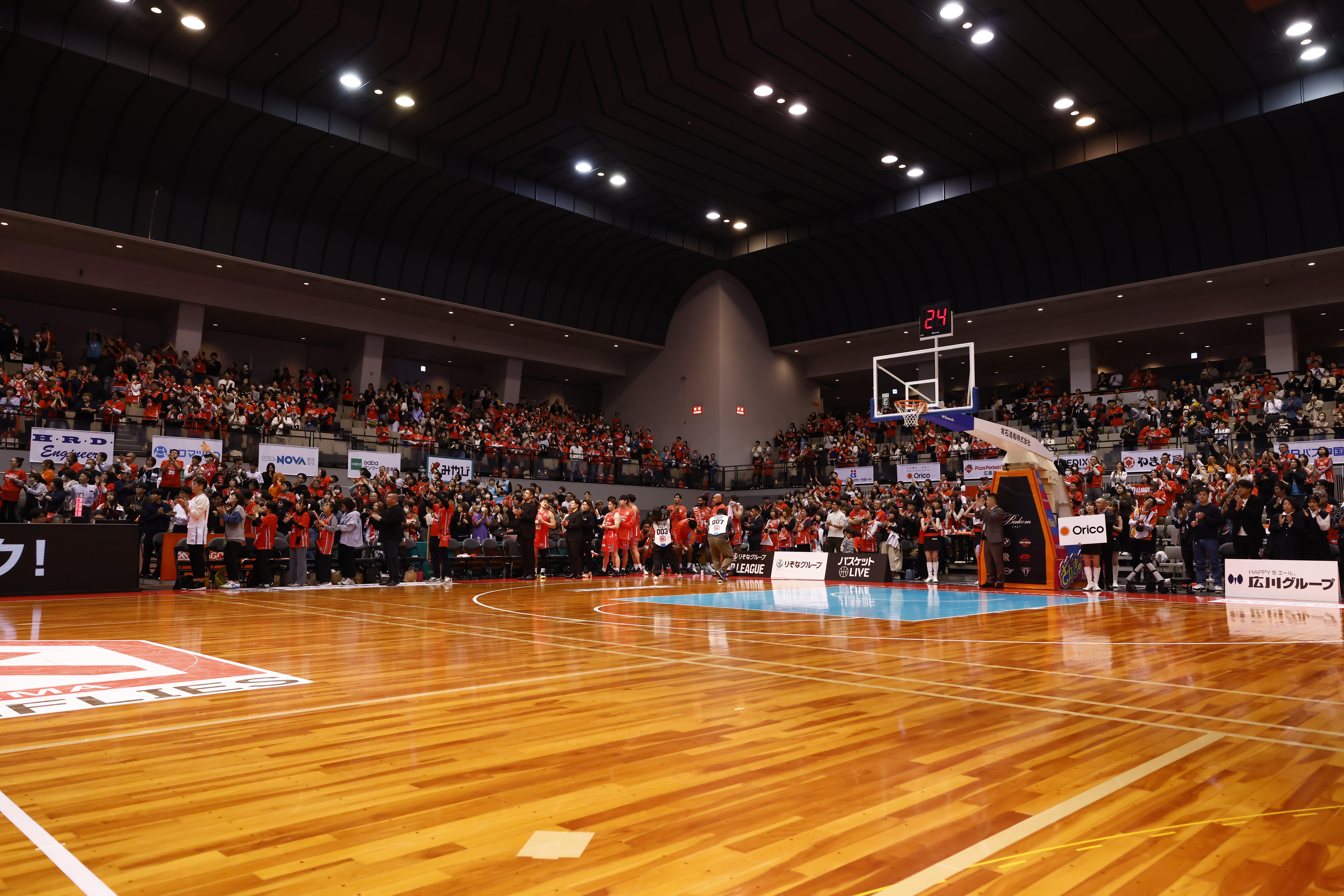 広島ドラゴンフライズは、熱い戦いを繰り広げてくれたアウェイチームへリスペクトを込めて、スタンディングオベーションでお送りしています。