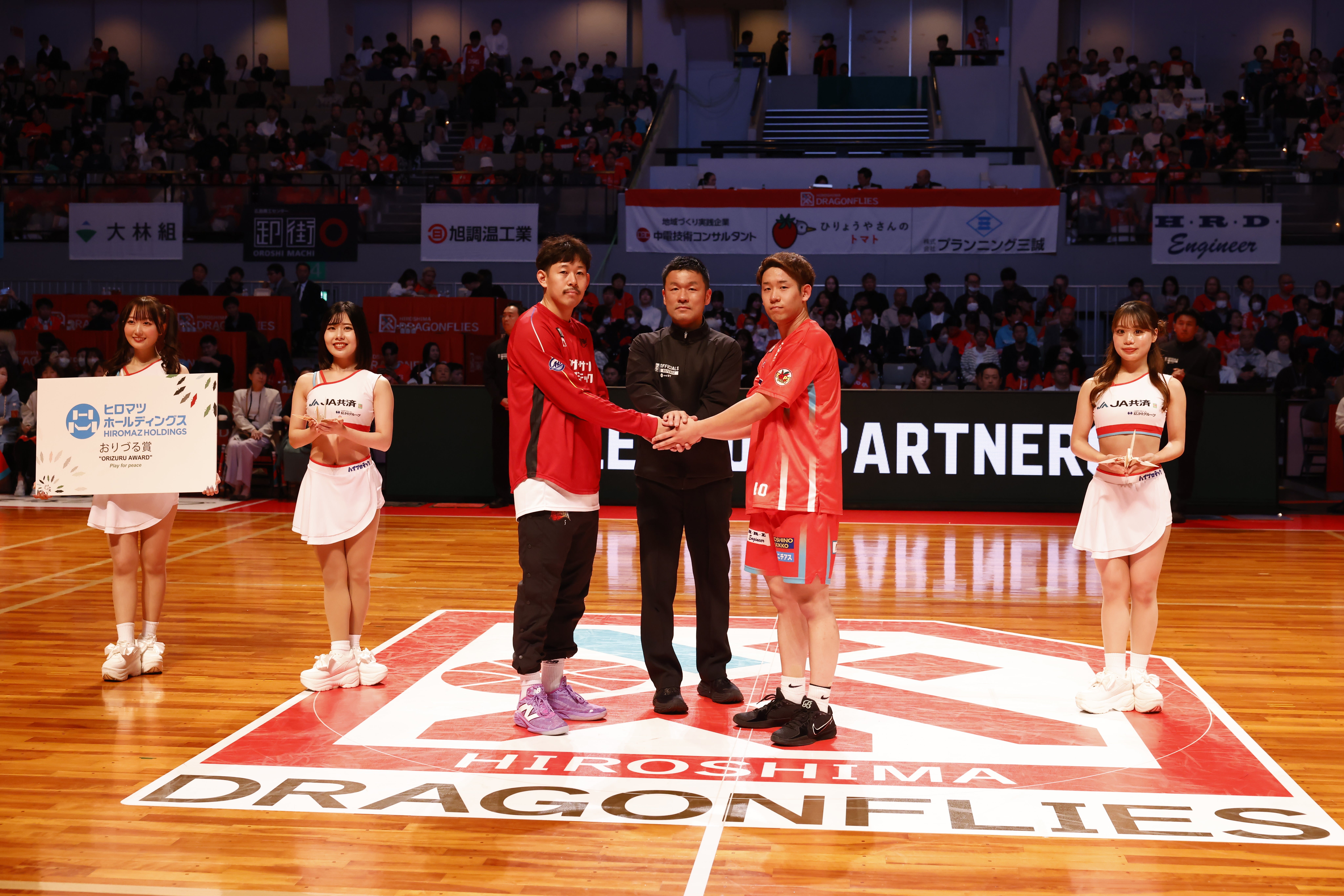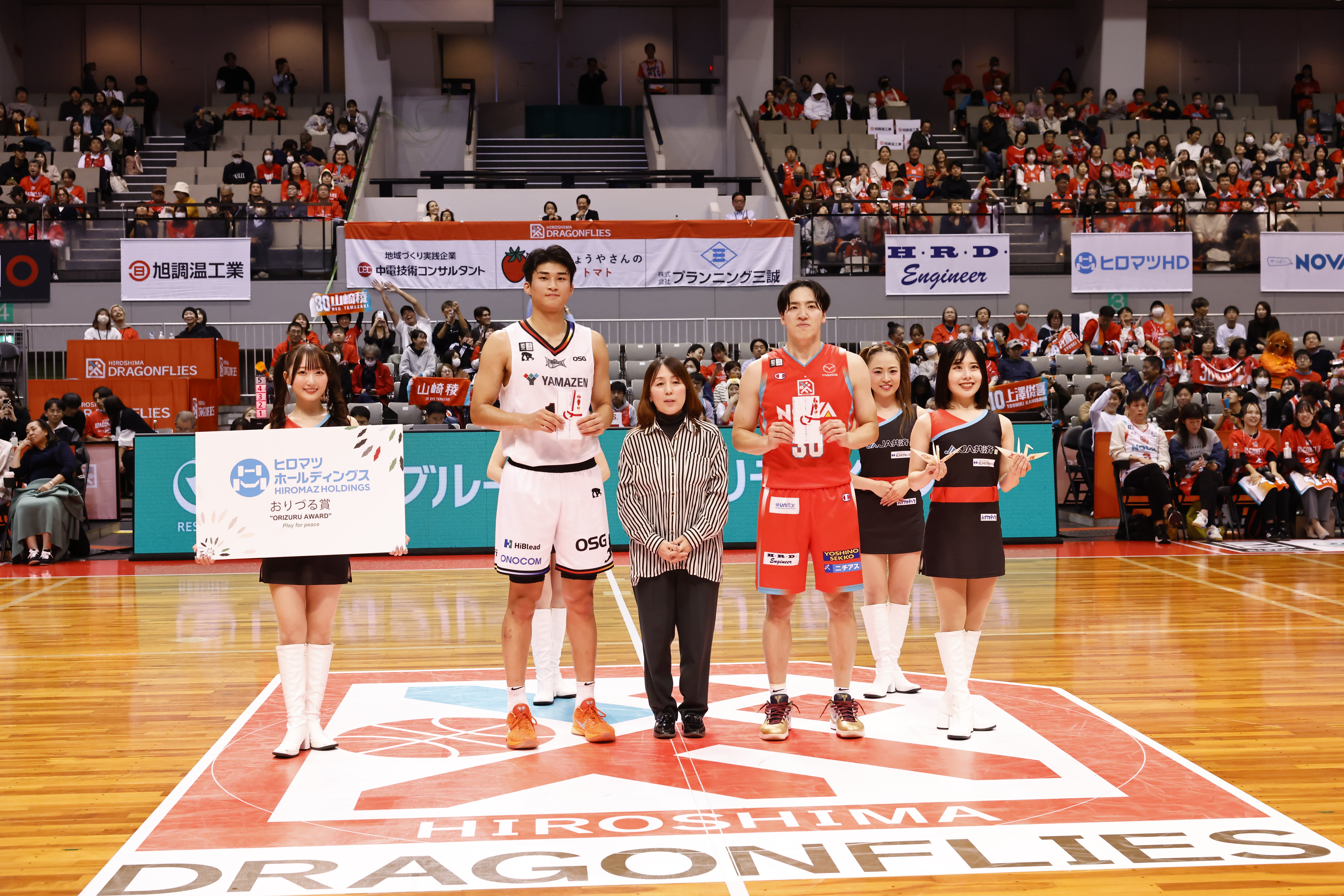 試合開始前には、両チームのキャプテンによるおりづる交換が行われました。試合を通して最もリスペクトに値する選手を表彰する「ヒロマツホールディングス presents おりづる賞」は、広島ドラゴンフライズ 山崎稜 選手、三遠ネオフェニックス 湧川颯斗 選手が受賞しました。