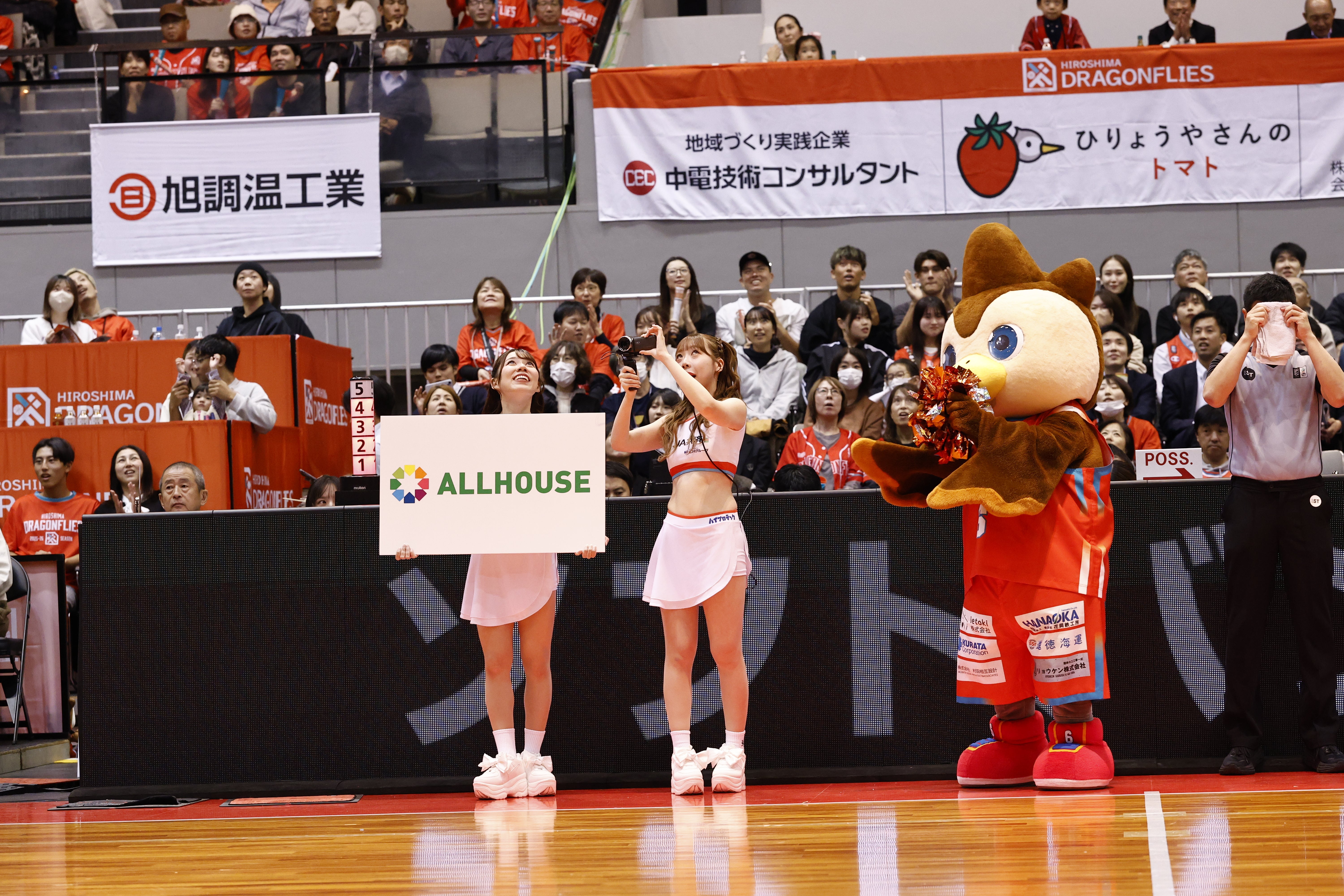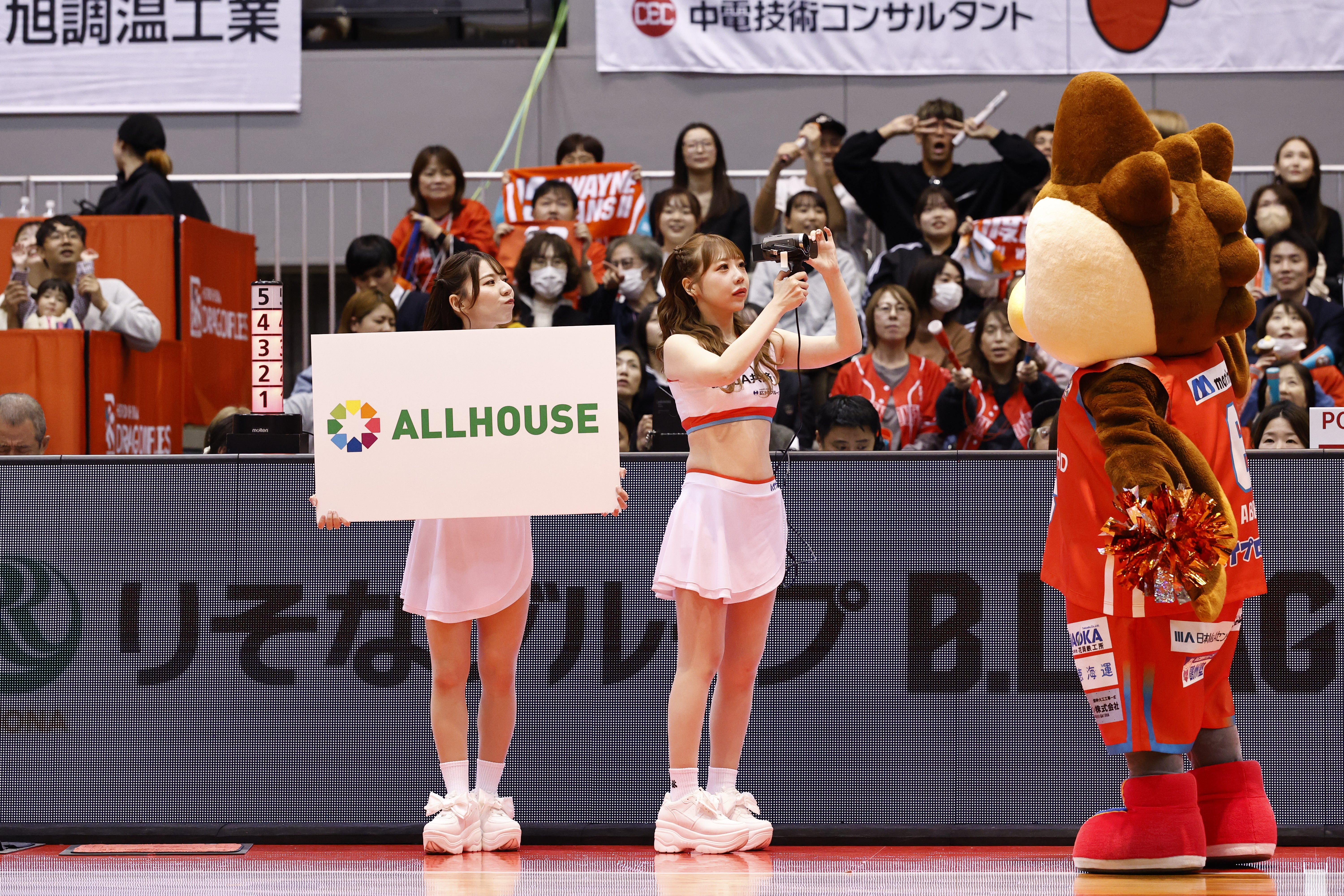 第2Qオフィシャルタイムアウトの、「未来のくらし 楽しく シンプルに」オールハウス presents カメラルーレットでは、D*Flareのカメラにアピールし、最後に4面ビジョンへ映し出された方に選手サイン入りミニバスケットボールがプレゼントされました。