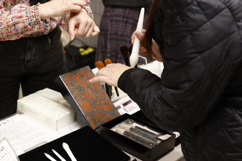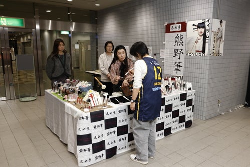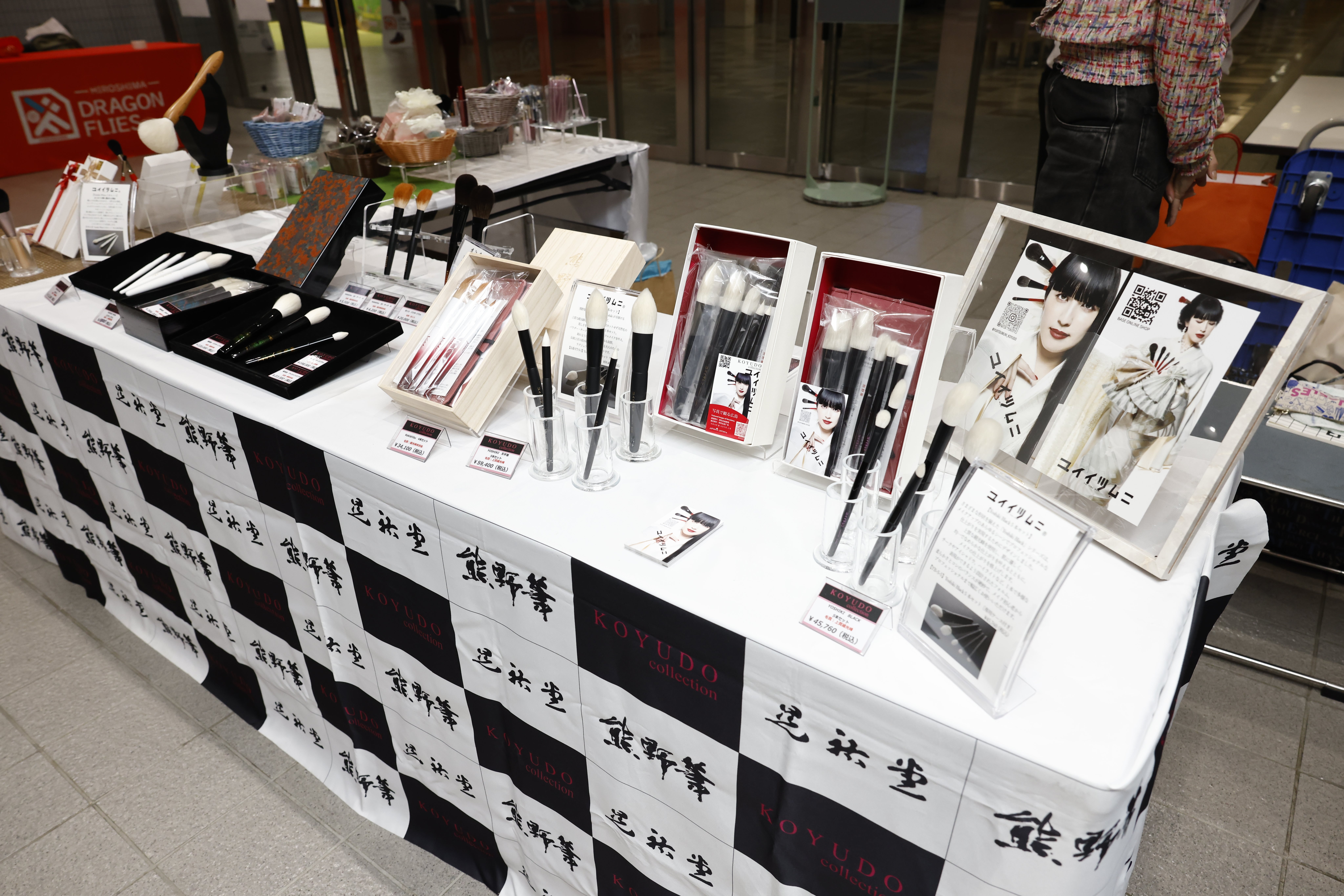 熊野筆の特設ブースでは、筆マスターYOSHIKI(ヨシキ)渾身の“ユイイツムニ”化粧筆をご用意いたしました。ビジョンに映し出されているポスターモデルを務めている方も、今日は実際にブースに立っていただきました。