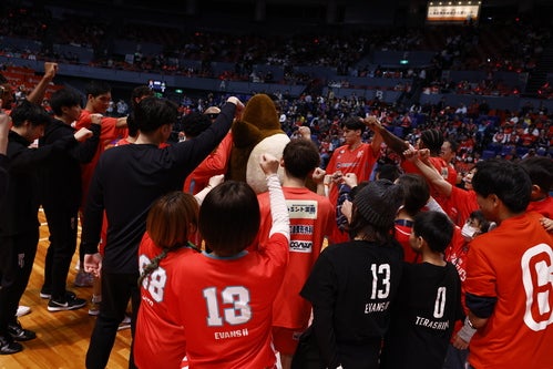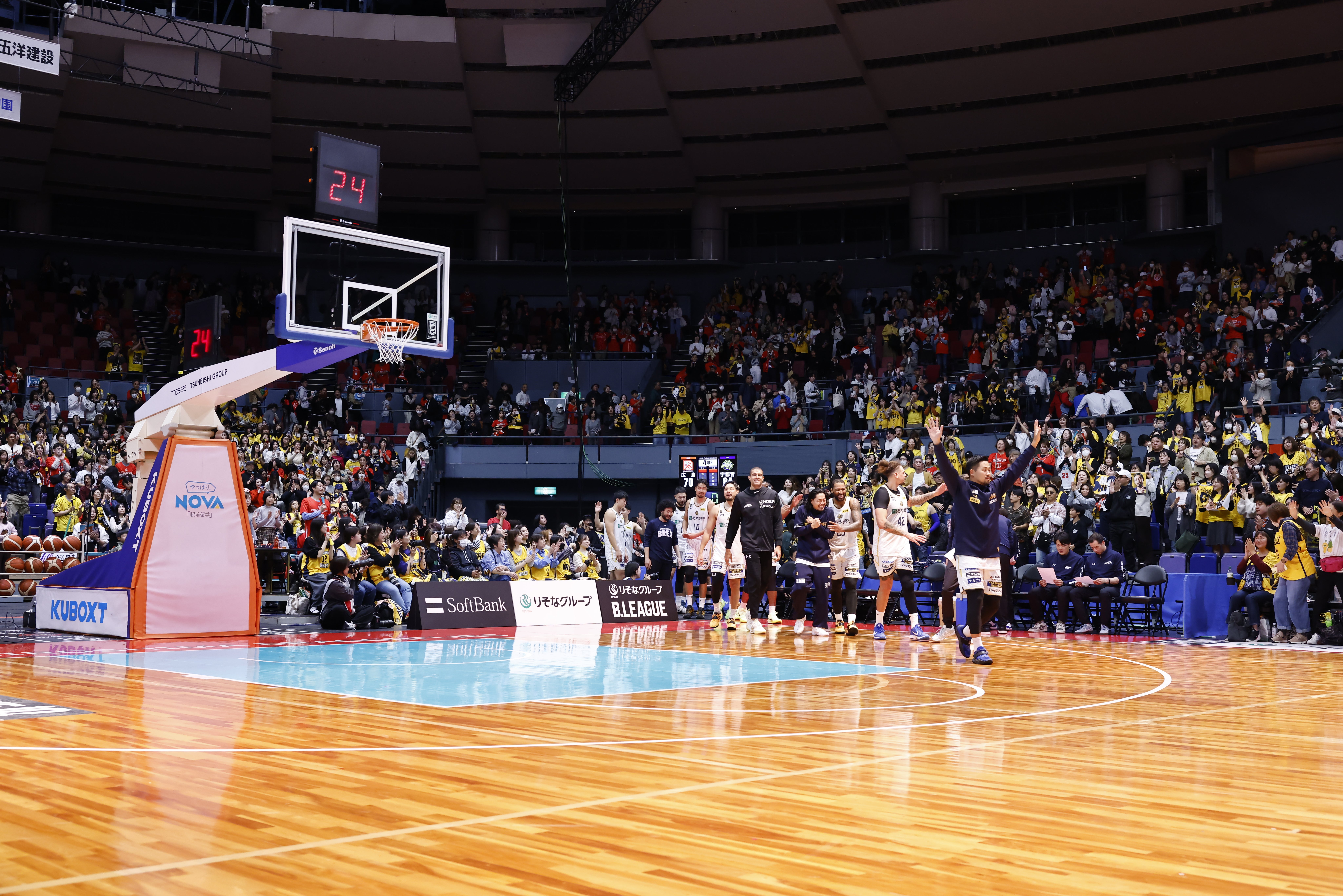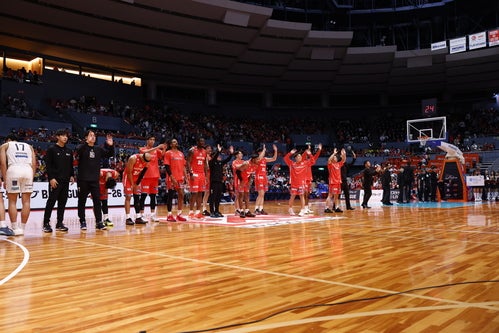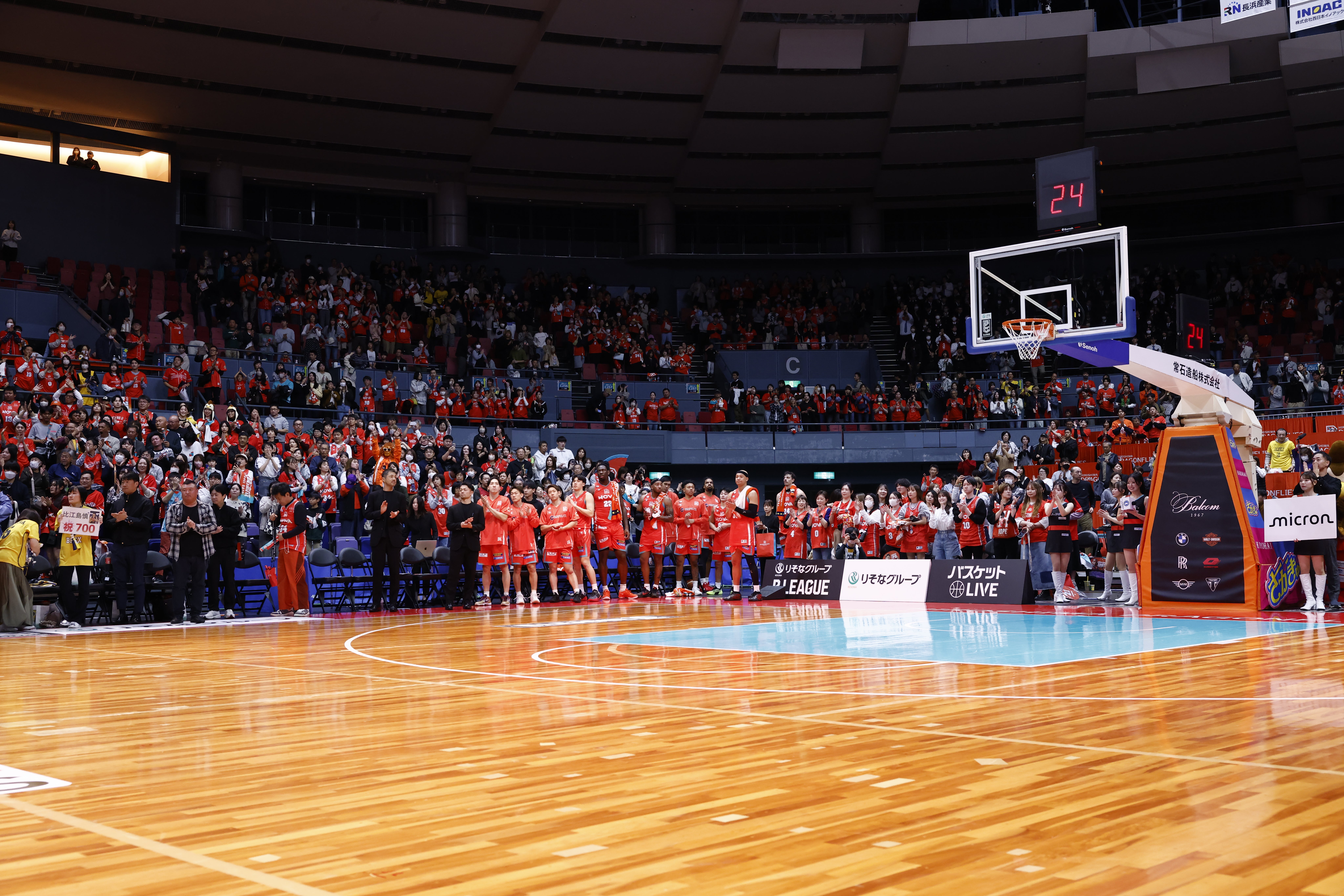 広島ドラゴンフライズは、熱い戦いを繰り広げてくれたアウェイチームへリスペクトを込めて、スタンディングオベーションでお送りしています。