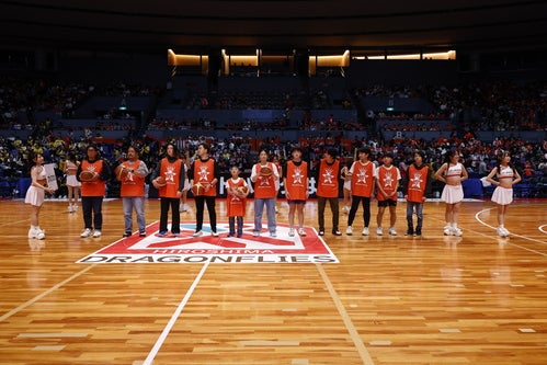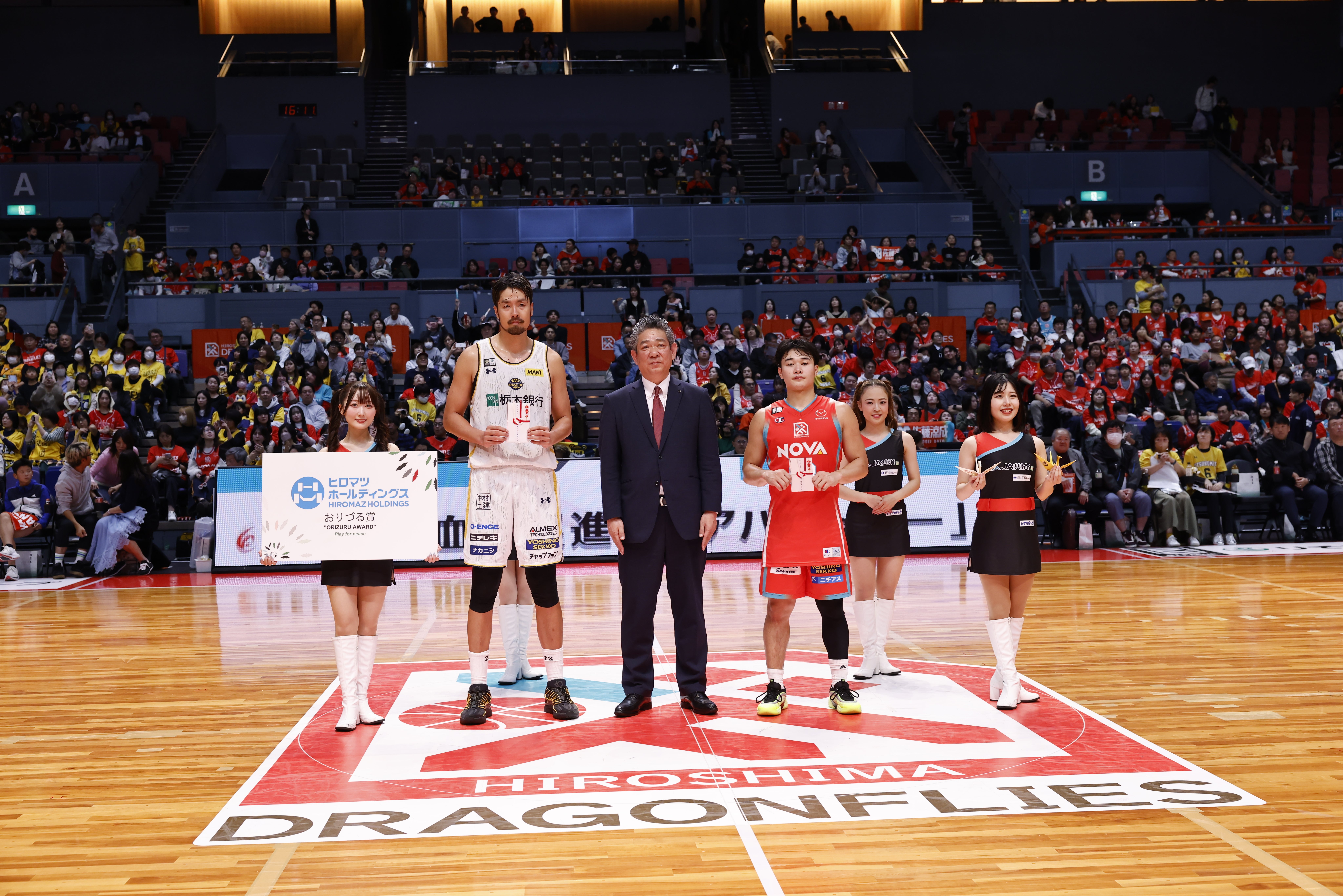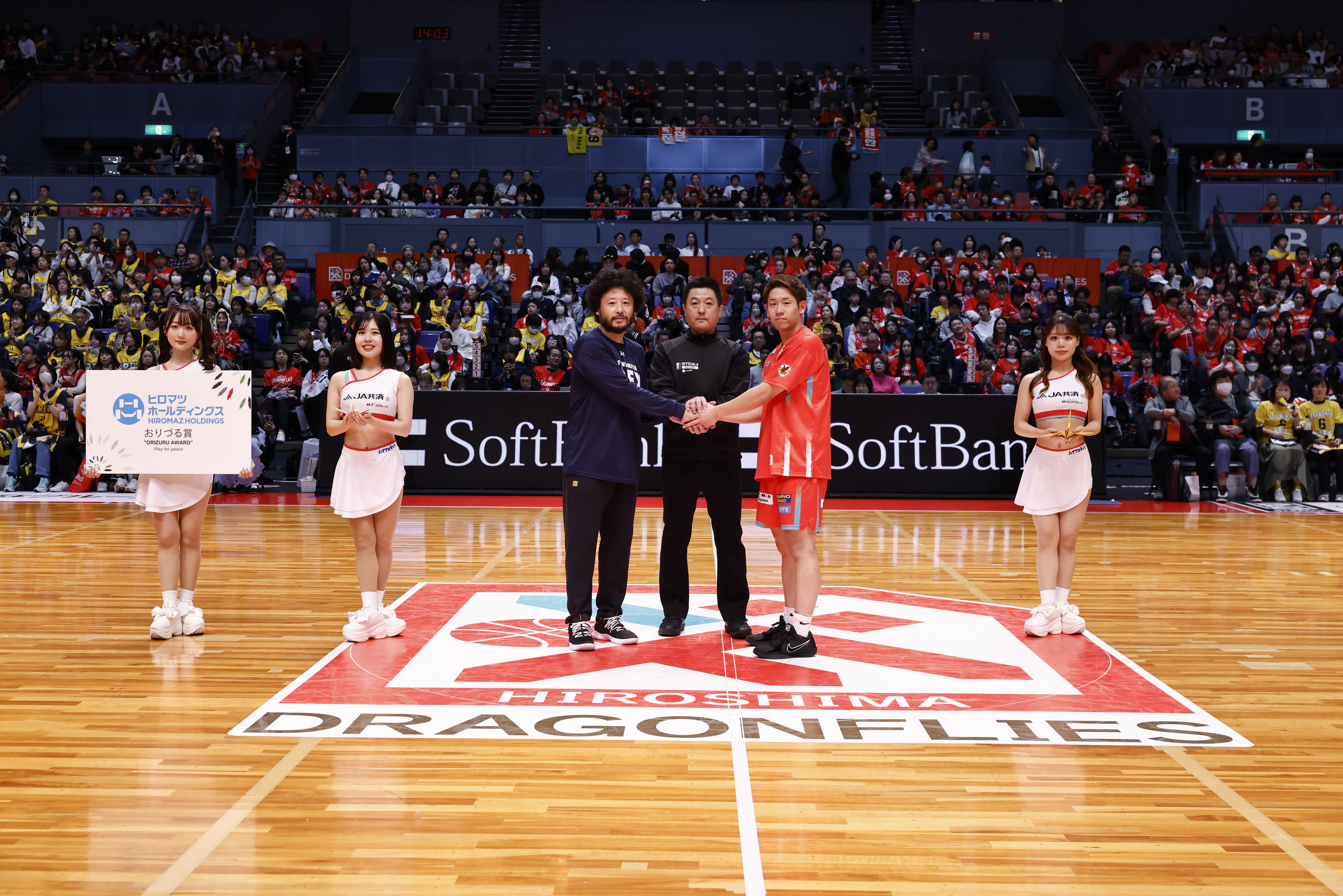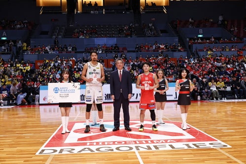 試合開始前には、両チームのキャプテンによるおりづる交換が行われました。試合を通して最もリスペクトに値する選手を表彰する「ヒロマツホールディングス presents おりづる賞」は、広島ドラゴンフライズ 佐藤涼成 選手、宇都宮ブレックス 竹内公輔 選手が受賞しました。