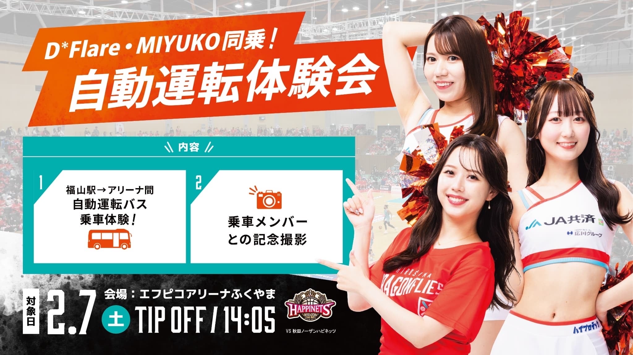 本ツアーには、広島ドラゴンフライズ公式アンバサダー MIYUKO と、専属パフォーマンスチーム D*Flare が同乗。自動運転バスの解説トークを聞きながら自動運転を体験できます。