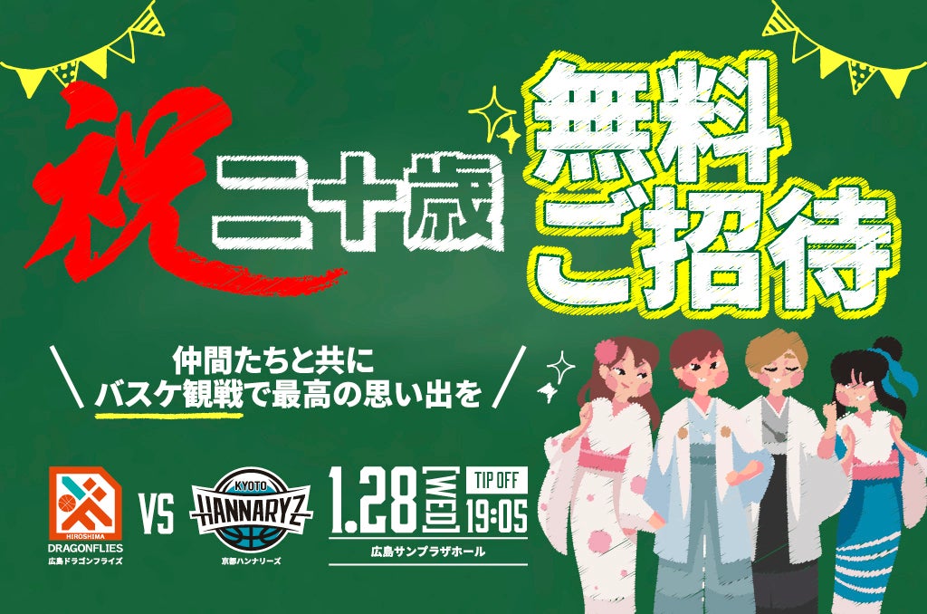 この度、1/28(水)京都ハンナリーズ戦におきまして、「祝二十歳!おめでとうキャンペーン企画」として、ご招待キャンペーンを実施いたします!