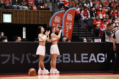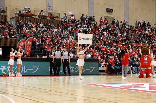 第2Qオフィシャルタイムアウトの、「未来のくらし 楽しく シンプルに」オールハウス presents カメラルーレットでは、D*Flareのカメラにアピールし、最後に4面ビジョンへ映し出された方に選手サイン入りミニバスケットボールがプレゼントされました。