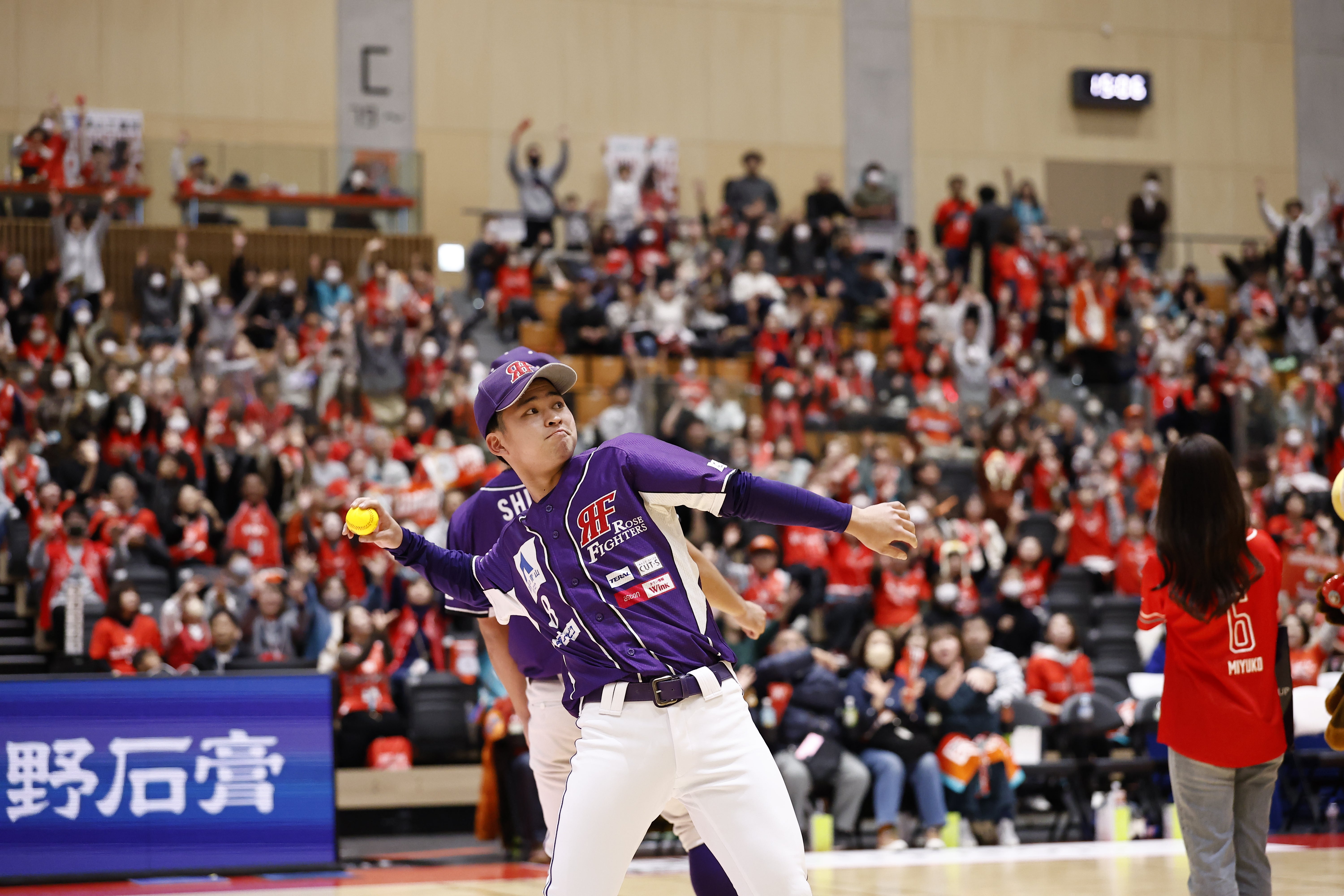 ハーフタイムでは、一心グループの社員が所属する福山市の野球チーム「福山ローズファイターズ」も撮影に協力した映画「栄光のバックホーム」のPRタイムを実施しました。PRタイム後は福山ローズファイターズ選手たちが投げ込むボールをゲットで豪華賞品を獲得できる投げ込みイベントも実施いたしました。