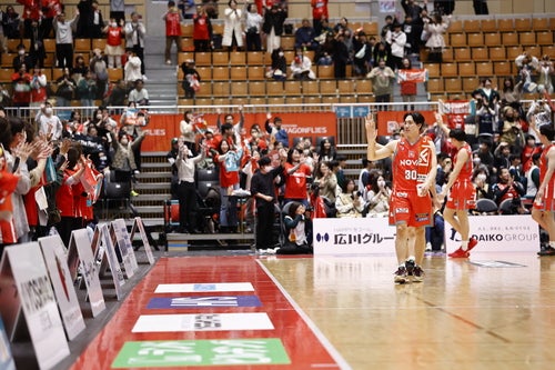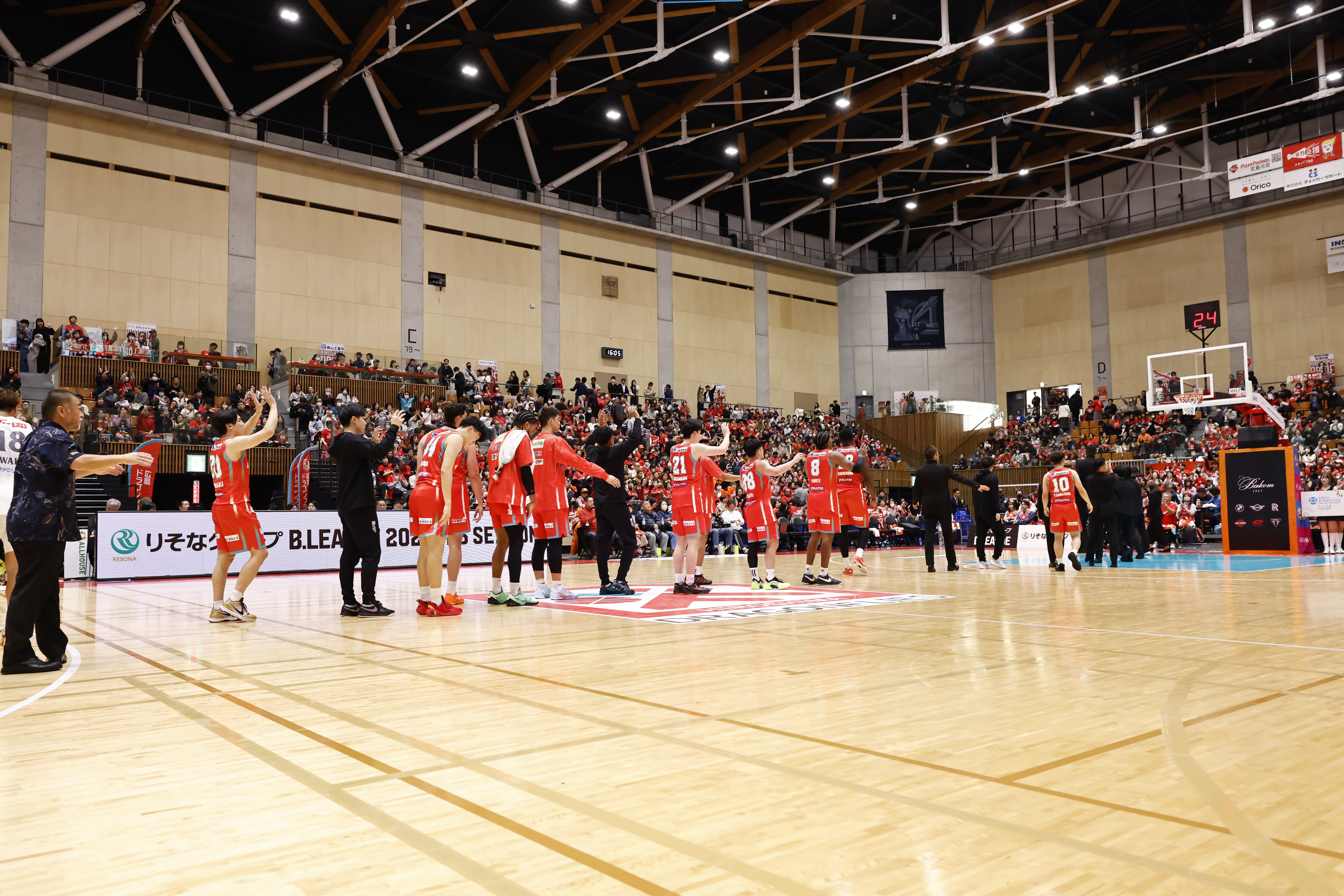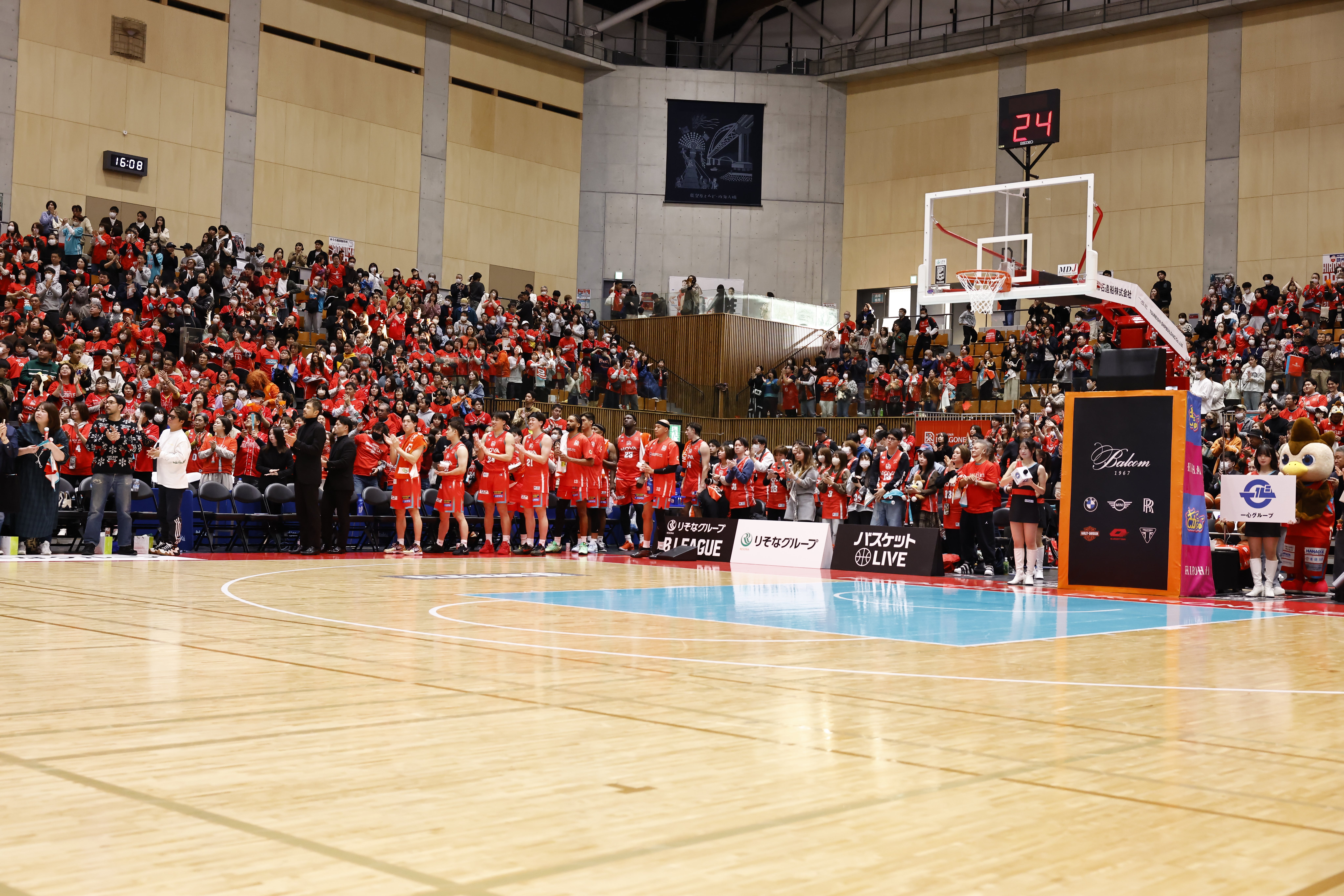広島ドラゴンフライズは、熱い戦いを繰り広げてくれたアウェイチームへリスペクトを込めて、スタンディングオベーションでお送りしています。