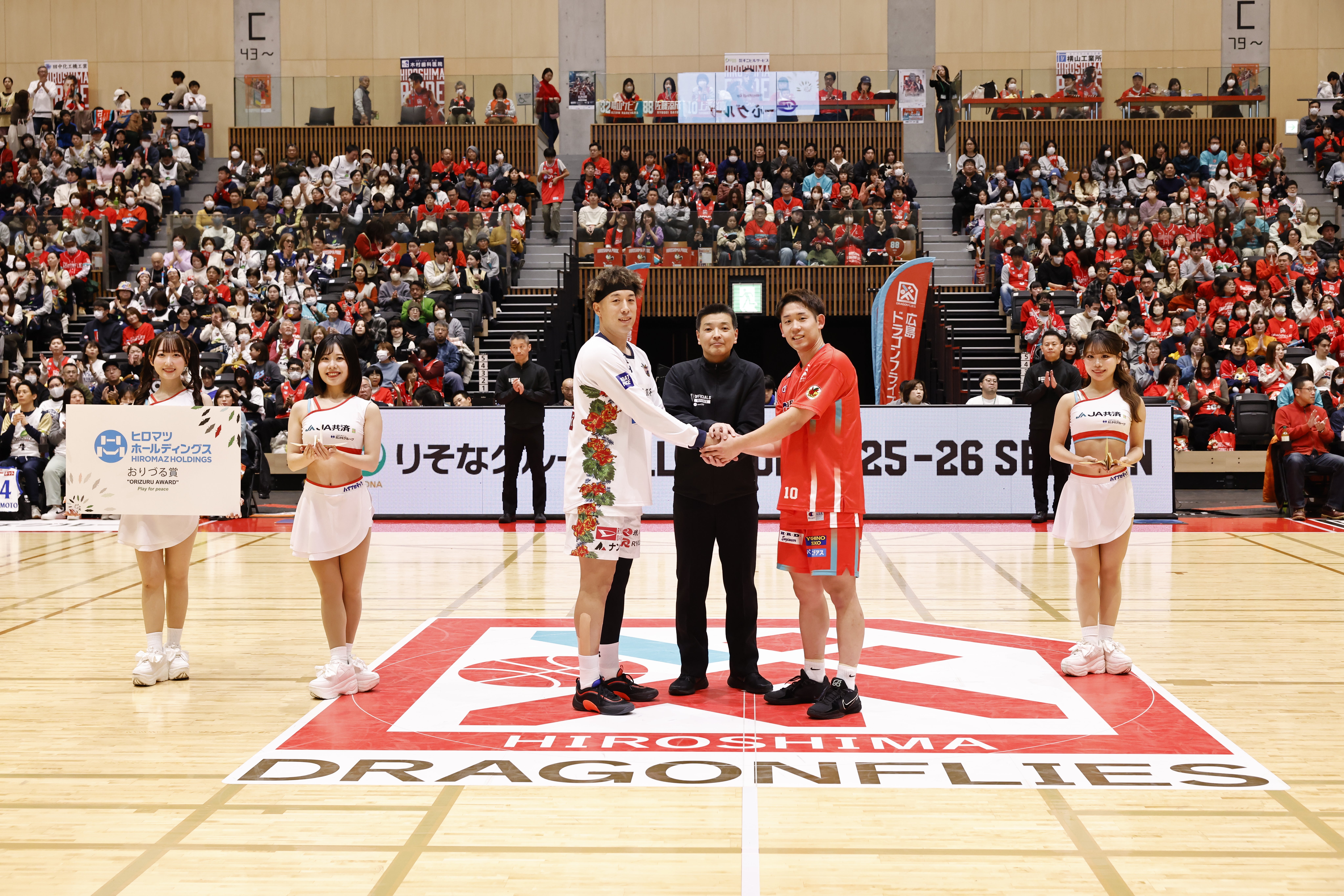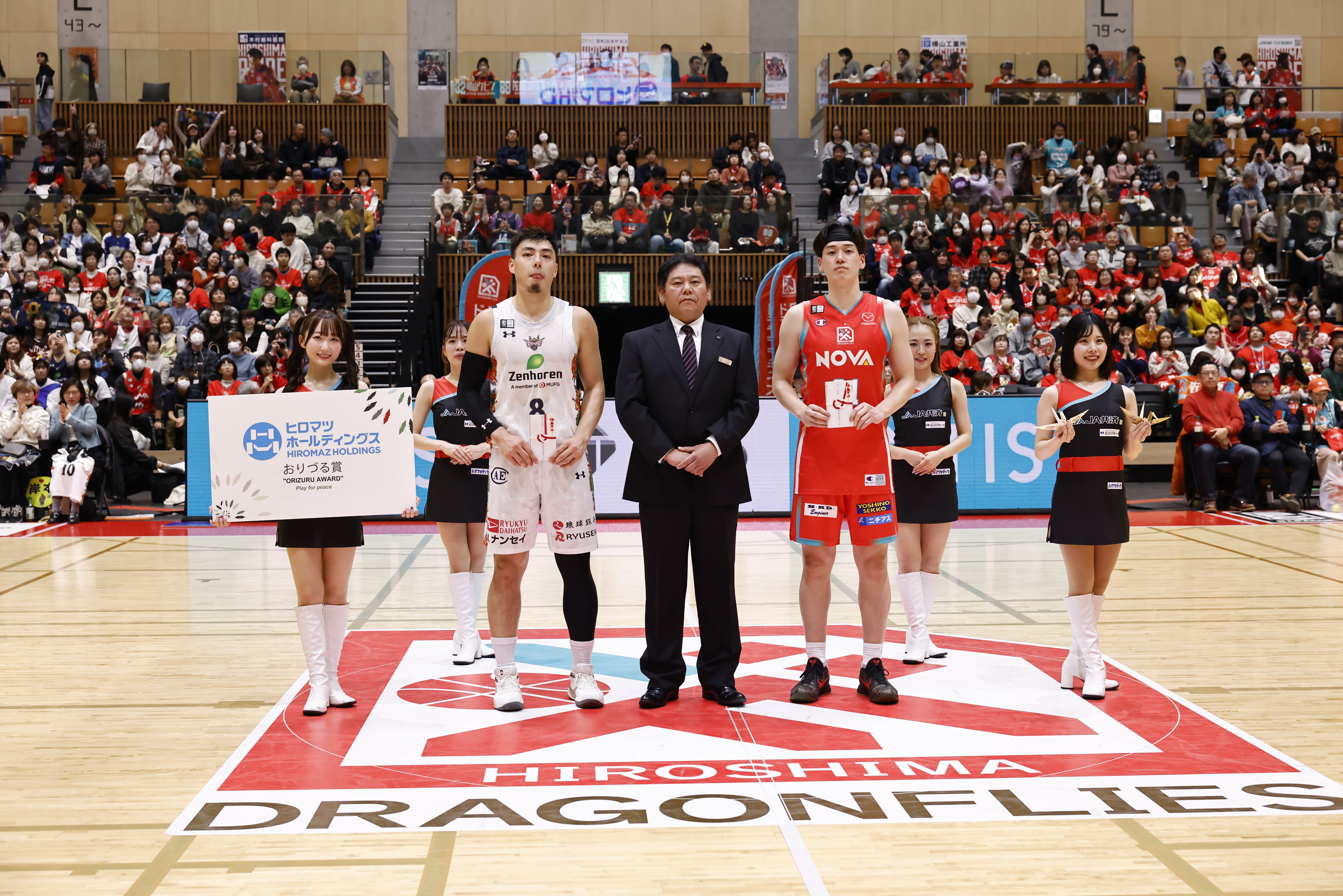 試合開始前には、両チームのキャプテンによるおりづる交換が行われました。試合を通して最もリスペクトに値する選手を表彰する「ヒロマツホールディングス presents おりづる賞」は、広島ドラゴンフライズ 渡部琉 選手、琉球ゴールデンキングス 佐土原遼 選手が受賞しました。