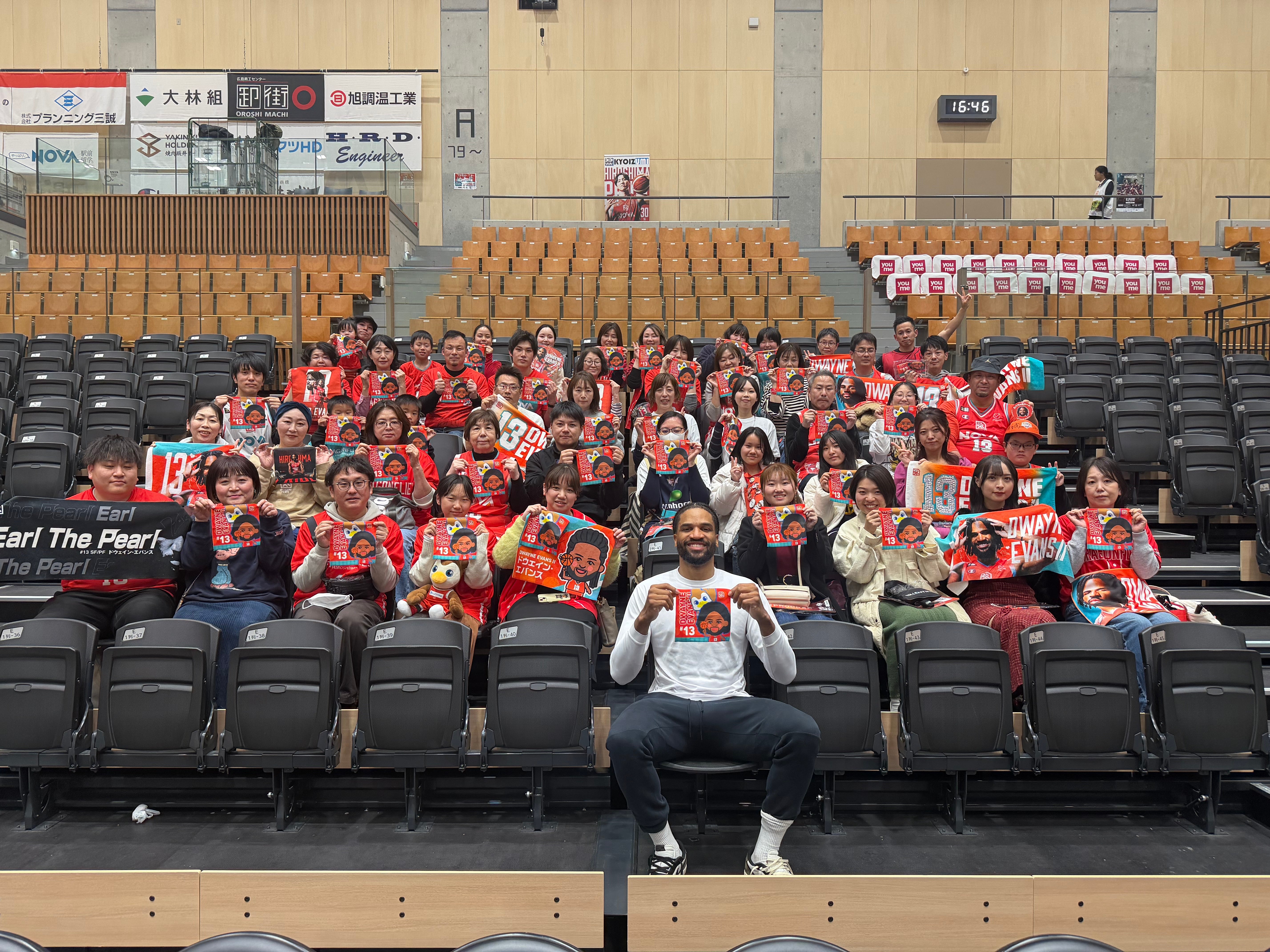 12/7(日)琉球ゴールデンキングス戦では「エバちゃんシート」を販売し、ご購入いただきました方にグッズの手渡しと集合写真撮影を行いました。