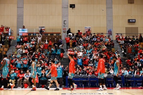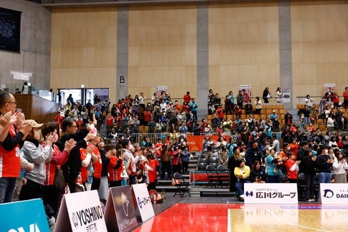 広島ドラゴンフライズは、熱い戦いを繰り広げてくれたアウェイチームへリスペクトを込めて、スタンディングオベーションでお送りしています。