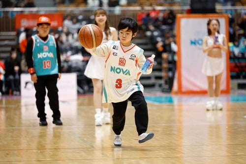 ハーフタイムでは、アシードホールディングス presents 「スポリカ持ってドリブルリレー」を実施しました。3人1組のスポリカチームとミルクセーキチームに分かれて、アシードホールディングスと広島ドラゴンフライズのコラボドリンク"スポリカ"をバトンにしてドリブルリレーを開催いたしました。