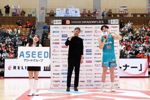 アシードホールディングス presents MOM賞は、ドウェイン・エバンス 選手が受賞しました。アシードビバレッジプラス株式会社 代表取締役社長 寺地洋平 様より、「広島ドラゴンフライズとのコラボドリンク"スポリカ"1年分」が贈呈されました。