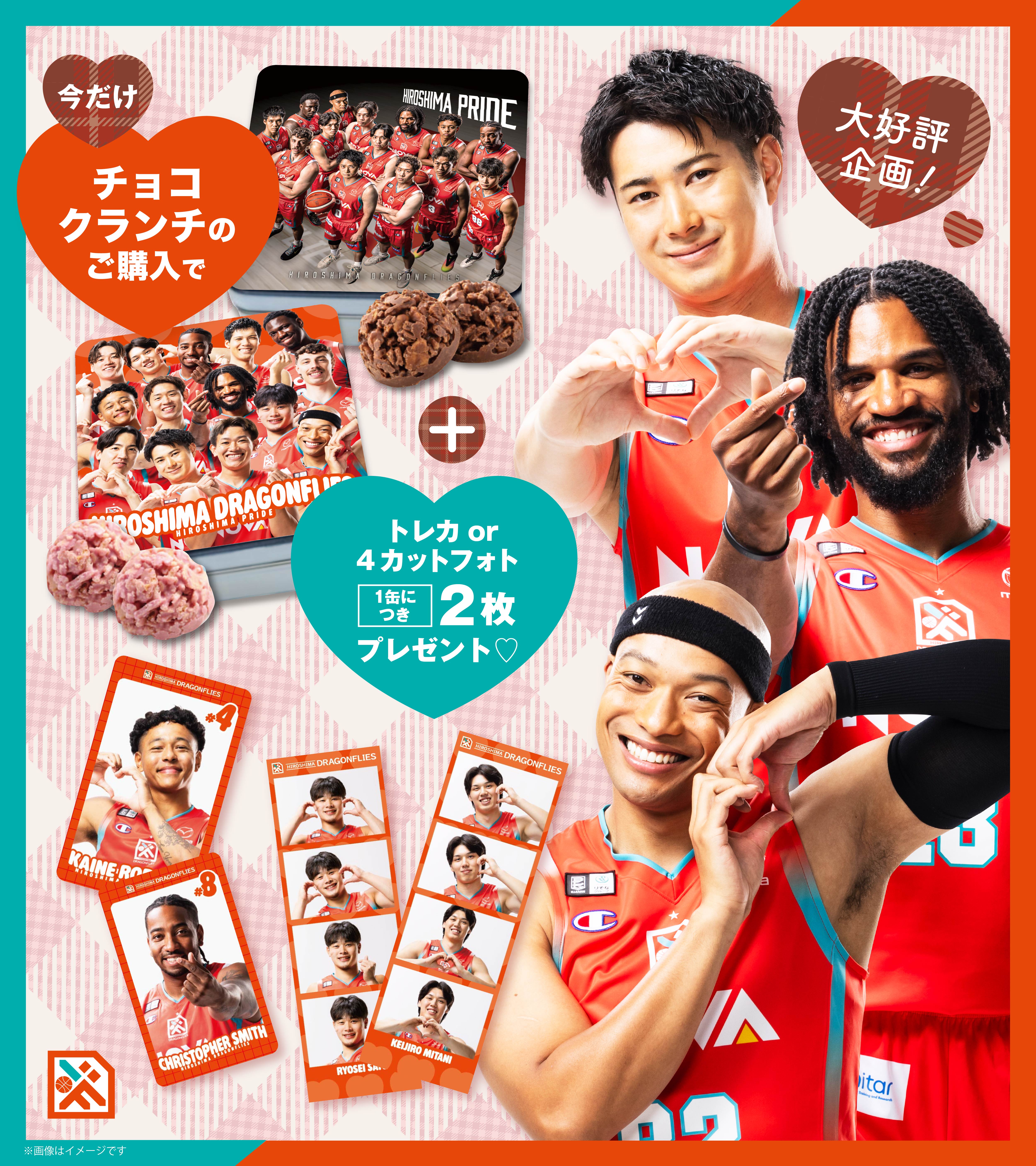 新商品のチョコクランチ缶をご購入のお客様全員に、選手ハートポーズトレカ or 4カットフォト2枚をプレゼントいたします!選手の個性あふれるハートポーズをご堪能ください❤
