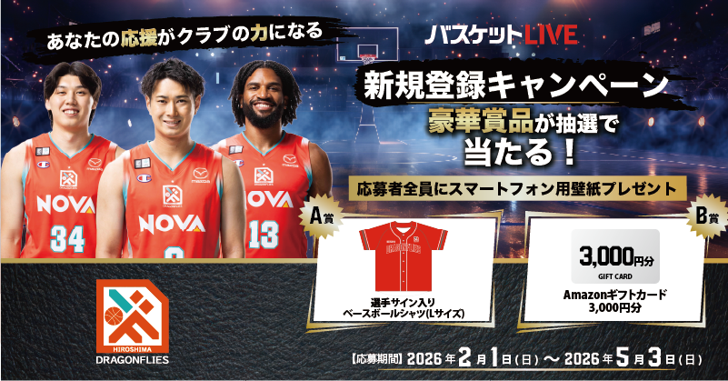 今シーズンも後半戦に突入し、さらに熱い試合が続くこの時期に「バスケットLIVE 新規登録キャンペーン」を実施いたします。バスケットLIVEの新規ご利用登録&視聴を行っていただき、応募フォームからエントリーしていただくと、抽選で選べる豪華賞品が当たるキャンペーンを実施いたします。下記のクラブ専用URLから登録を行っていただくことでクラブへの支援にも繋がりますので、既にご登録いただいている方はお近くの皆さまにもご紹介頂きますようお願いいたします!