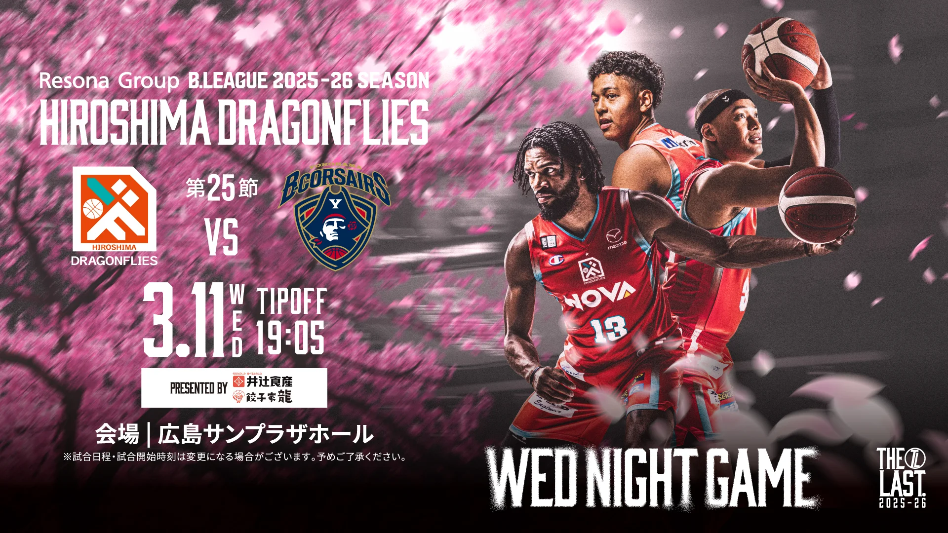 広島ドラゴンフライズは3月11日(水)、広島サンプラザホールにて「りそなグループ B.LEAGUE B1リーグ戦 第25節 広島ドラゴンフライズ vs 横浜ビー・コルセアーズ」を開催いたします。