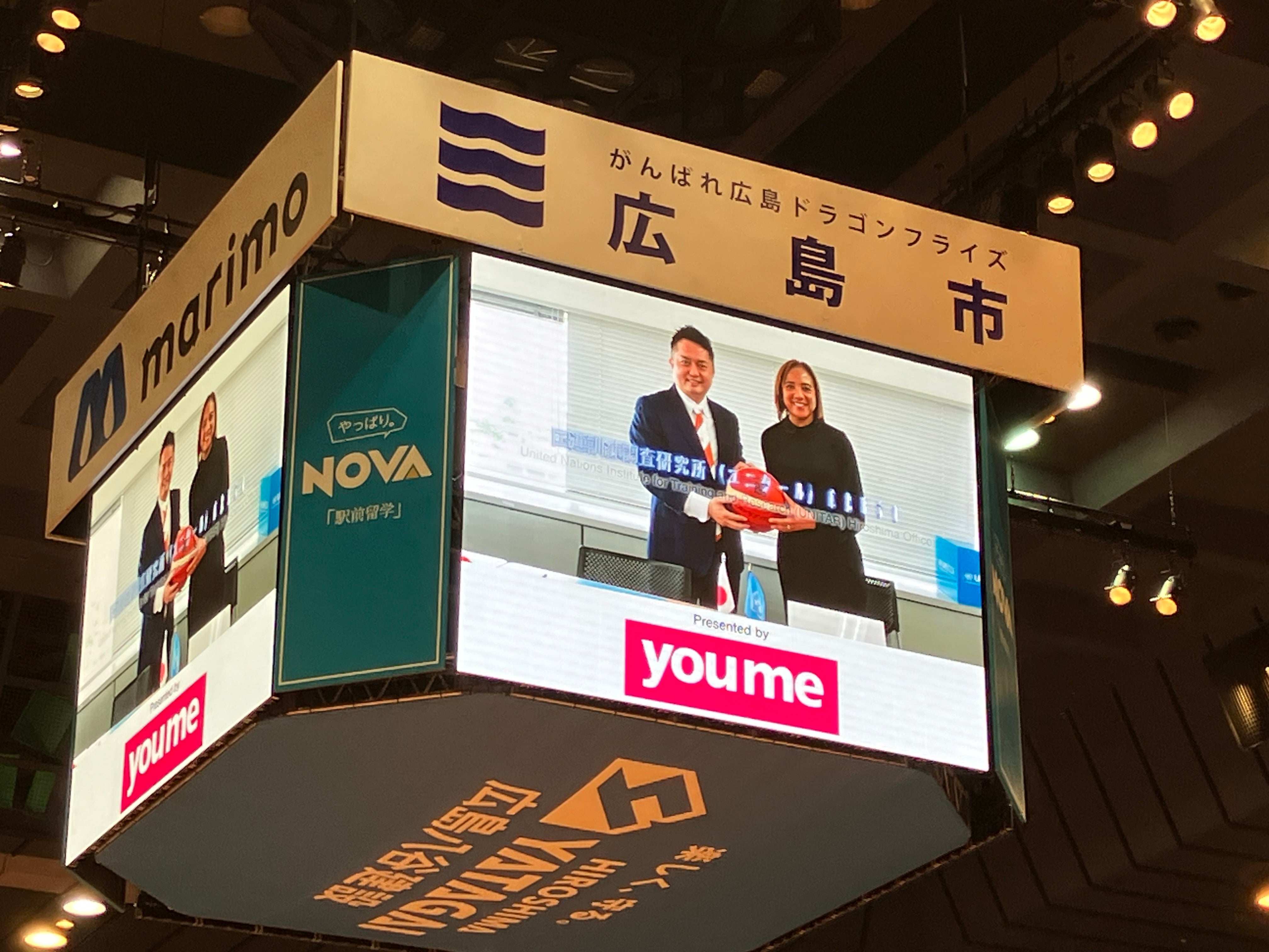 4/6(月)「開発と平和のためのスポーツ国際デー」にあわせ、広島ドラゴンフライズと国連ユニタールの取り組みを紹介する映像を放映いたしました。両者はSDGs達成に向けて連携を深めており、選手はユニタールロゴ入りユニフォームでプレーしています。スポーツを通じて、平和で持続可能な未来の実現を目指しています。