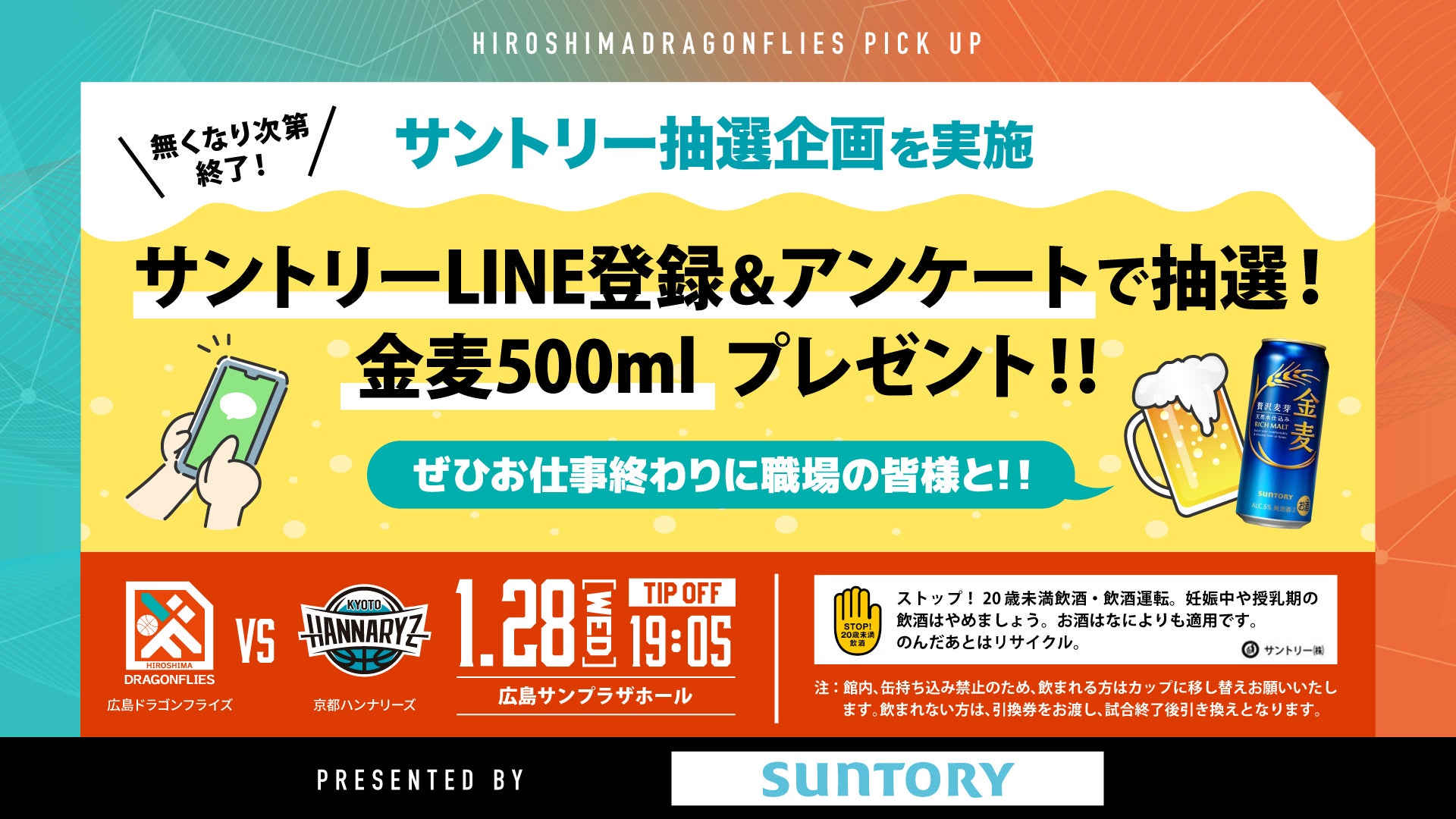 SUNTORY PRESENTS サントリーLINE登録&アンケートで抽選!金麦500mlプレゼント -1/28(水)京都ハンナリーズ戦-